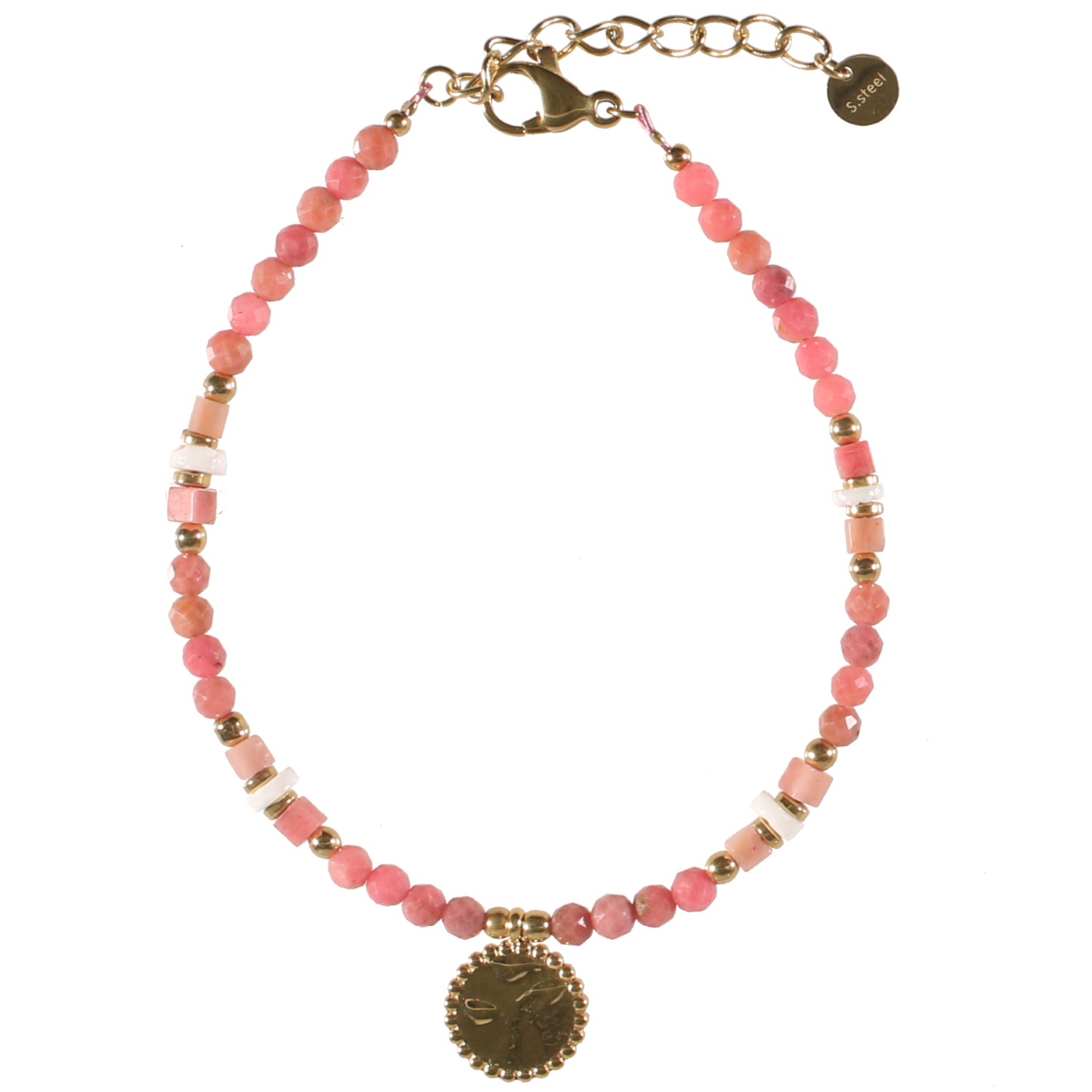 Description Bracelet composé de perles en acier doré, de perles en véritable pierre de rhodonite et d'une pastille ronde martelée en acier doré. Fermoir mousqueton avec 3 cm de rallonge. Longueur 16+3 cm [Guide des tailles] Largeur 4 mm Matière(s) Acier , Pierre naturelle . L'acier utilisé dans la bijouterie existe sous plusieurs qualités. Nous utilisons principalement la qualité 316L, qualité qui est utilisée en chirurgie. Cet acier est donc inoxydable et reste très résistant. Fermoir Mousqueton À noter Pastille 10 mm de diamètre Couleur(s) dominante(s) Doré , Rouge Public Adolescent , Adulte . Genre Femme , Fille . Saison Indémodable . Cliquez sur une matière, un thème, une couleur ou une collection pour voir tous les articles associés.