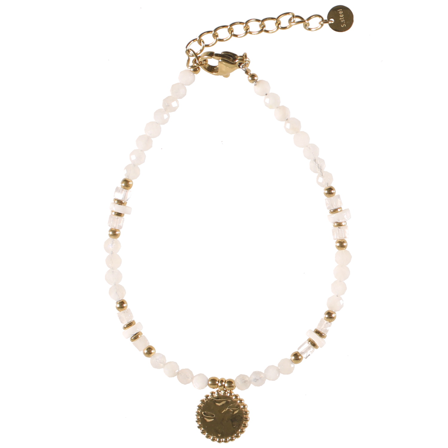 Bracelet composé de perles en acier doré, de perles en véritable pierre de lune et d'une pastille ronde martelée en acier doré.