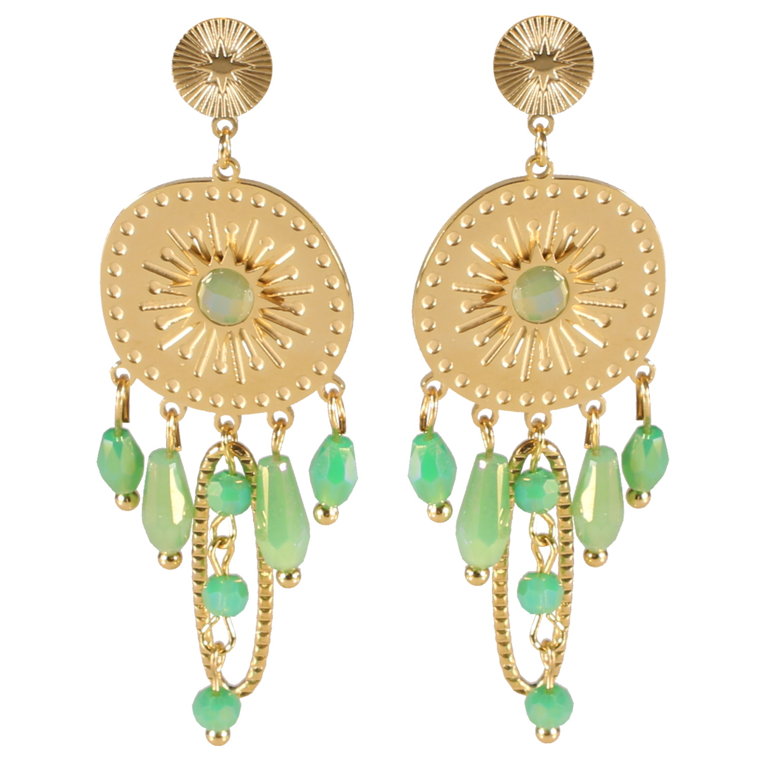 Description Boucles d'oreilles pendantes composées d'une puce ronde avec une étoile en acier doré, d'une pastille ronde représentant un soleil en acier doré surmontée d'une pierre de couleur verte et de pendants en perles de couleur verte et un maillon en acier doré. Largeur 20 mm Hauteur 55 mm Matière(s) Acier , Rocaille . L'acier utilisé dans la bijouterie existe sous plusieurs qualités. Nous utilisons principalement la qualité 316L, qualité qui est utilisée en chirurgie. Cet acier est donc inoxydable et reste très résistant. Fermoir Tiges poussettes Couleur(s) dominante(s) Doré , Vert Public Adolescent , Adulte . Genre Femme , Fille . Saison Indémodable . Thème(s) Nature . Cliquez sur une matière, un thème, une couleur ou une collection pour voir tous les articles associés.