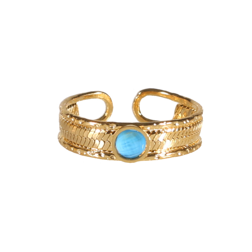 Description Bague en forme de chaîne maille serpent en acier doré surmontée d'un cristal de couleur turquoise serti clos de forme ronde. Taille ajustable. Largeur 5 mm Matière(s) Acier , Verre . L'acier utilisé dans la bijouterie existe sous plusieurs qualités. Nous utilisons principalement la qualité 316L, qualité qui est utilisée en chirurgie. Cet acier est donc inoxydable et reste très résistant. Fermoir Aucun Couleur(s) dominante(s) Bleu , Doré Public Adolescent , Adulte . Genre Femme , Fille . Saison Indémodable . Cliquez sur une matière, un thème, une couleur ou une collection pour voir tous les articles associés.