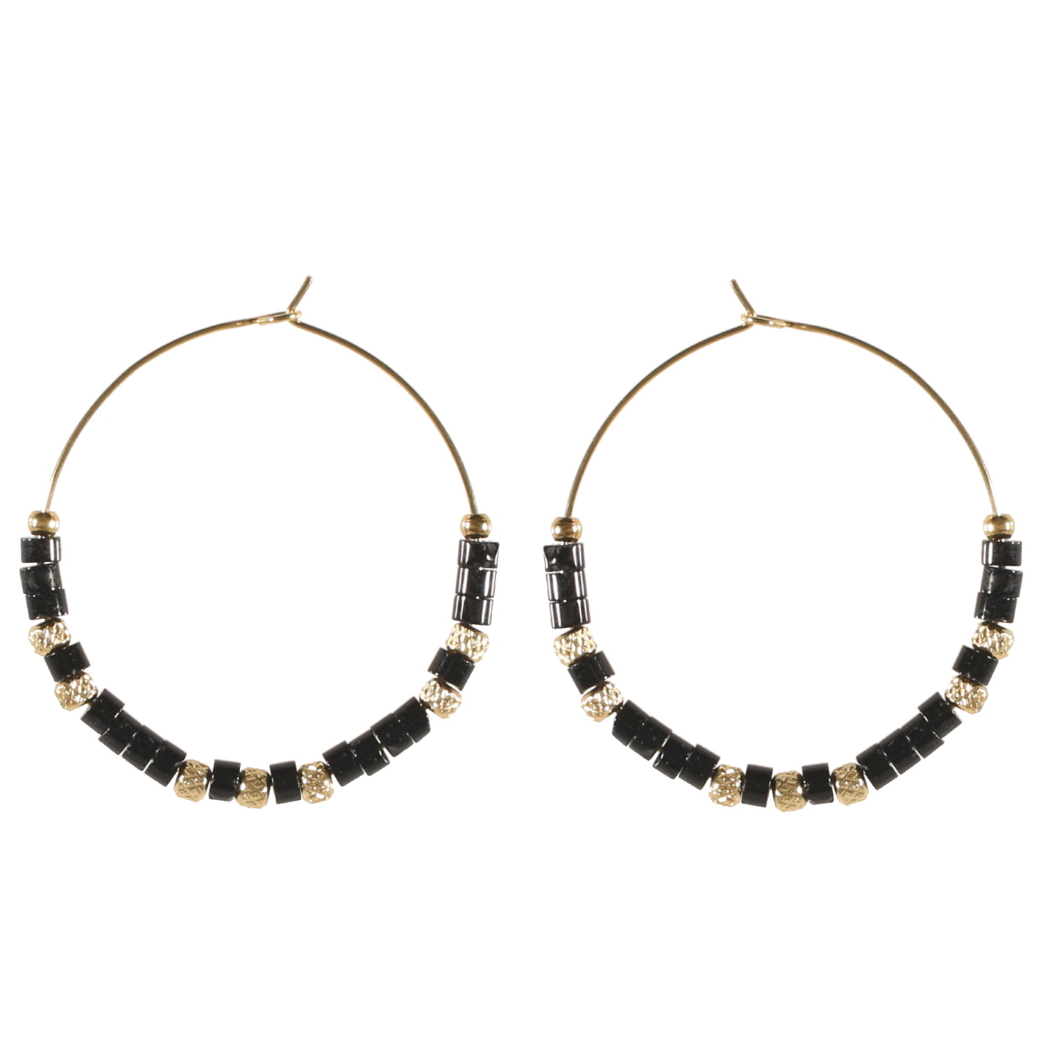 Boucles d'oreilles créoles en acier doré et perles Miyuki de couleur noire.