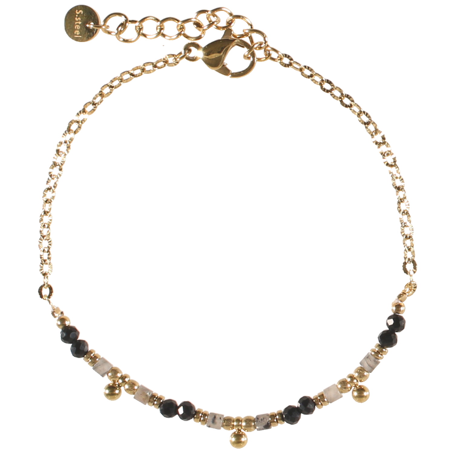 Bracelet composé d'une chaîne avec perles en acier doré et de perles rondes et cylindriques en véritable pierre d'agate.