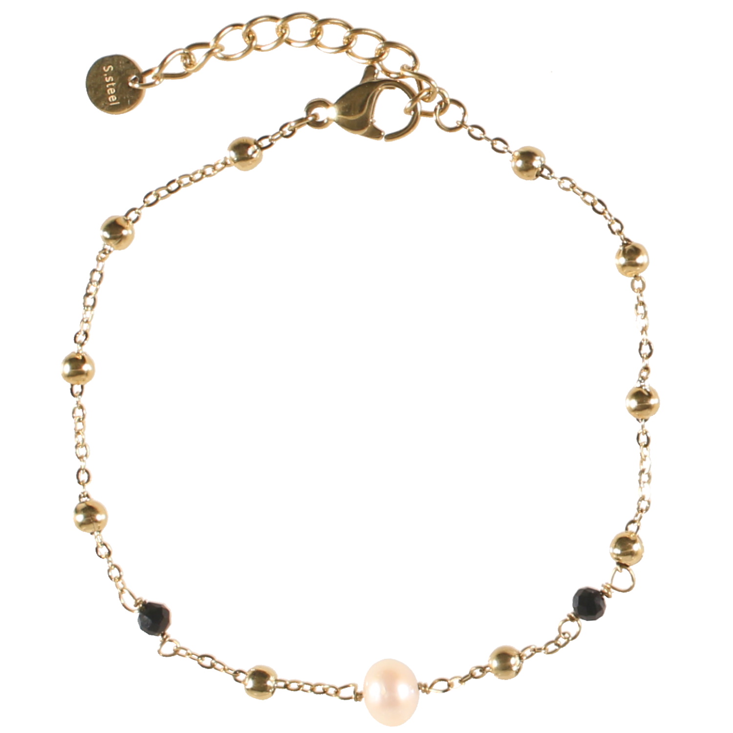 Bracelet composé d'une chaîne avec perles en acier doré, une perle de nacre et deux perles de véritable pierre d'agate.