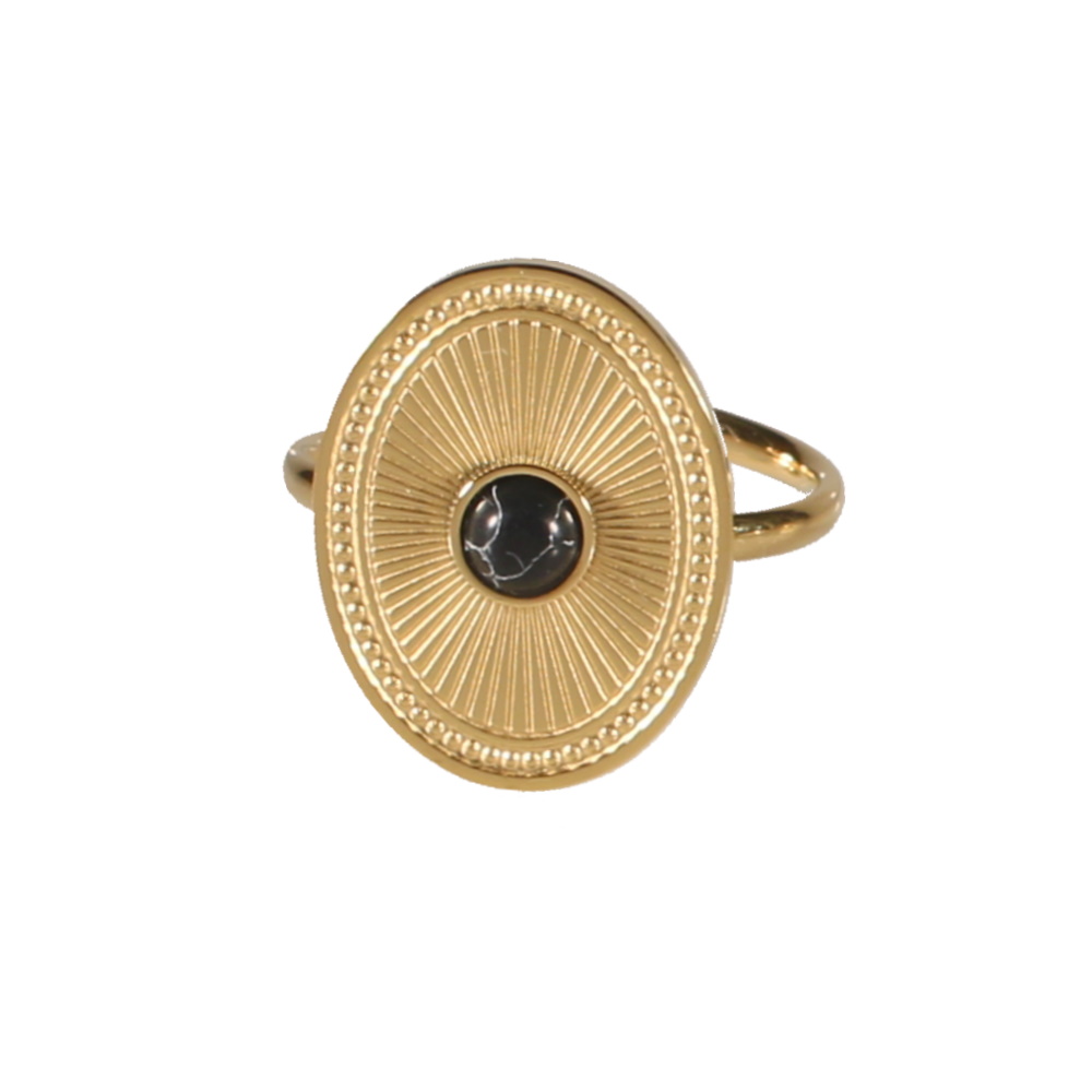 Description Bague avec une pastille ovale avec motifs de rayons en acier doré surmontée d'un cabochon rond de couleur noire. Taille ajustable. Largeur 18 mm Matière(s) Acier , Rocaille . L'acier utilisé dans la bijouterie existe sous plusieurs qualités. Nous utilisons principalement la qualité 316L, qualité qui est utilisée en chirurgie. Cet acier est donc inoxydable et reste très résistant. Fermoir Aucun Couleur(s) dominante(s) Doré , Noir Public Adolescent , Adulte . Genre Femme , Fille . Saison Indémodable . Cliquez sur une matière, un thème, une couleur ou une collection pour voir tous les articles associés.