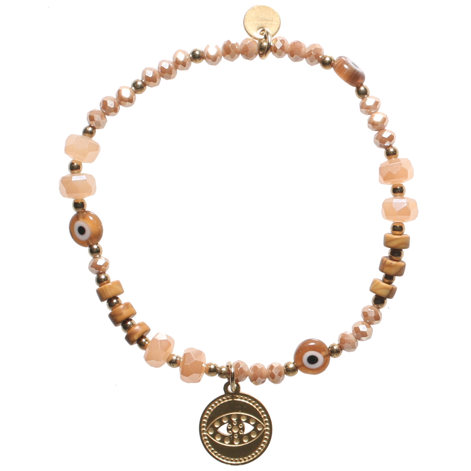 Bracelet élastique composé de perles en acier doré, de perles de couleur marron, de trois perles avec œil de Turquie et d'une pastille ronde en acier doré représentant un œil de Turquie.