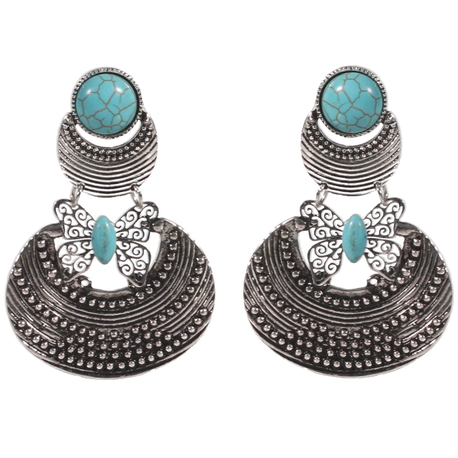 Boucles d'oreilles fantaisie en métal argenté vieilli et pierres d'imitation turquoise.