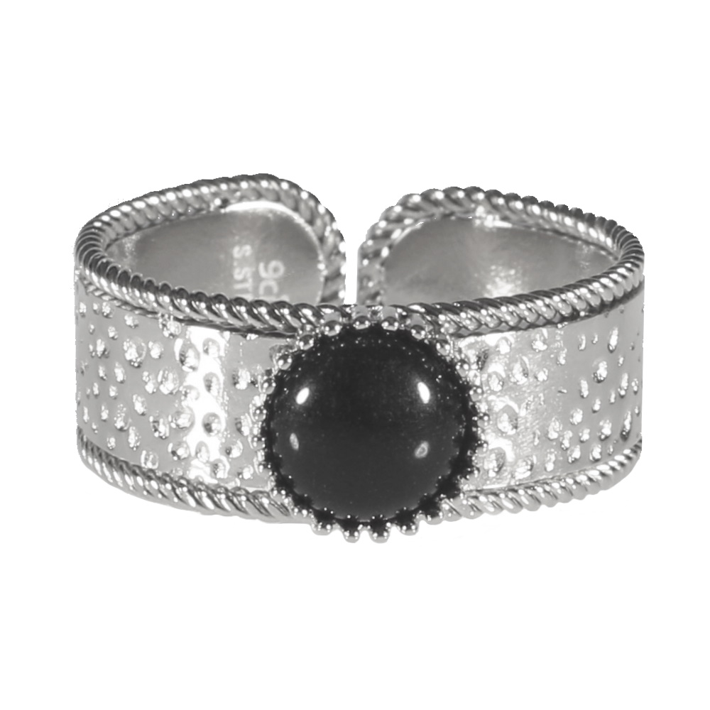 Description Bague martelée en acier 316L argenté surmontée d'une pierre de couleur noire sertie clos de forme ronde. Taille ajustable. Largeur 8 mm Matière(s) Acier , Rocaille . L'acier utilisé dans la bijouterie existe sous plusieurs qualités. Nous utilisons principalement la qualité 316L, qualité qui est utilisée en chirurgie. Cet acier est donc inoxydable et reste très résistant. Fermoir Aucun Couleur(s) dominante(s) Argenté , Noir Public Adolescent , Adulte . Genre Femme , Fille . Saison Indémodable . Cliquez sur une matière, un thème, une couleur ou une collection pour voir tous les articles associés.