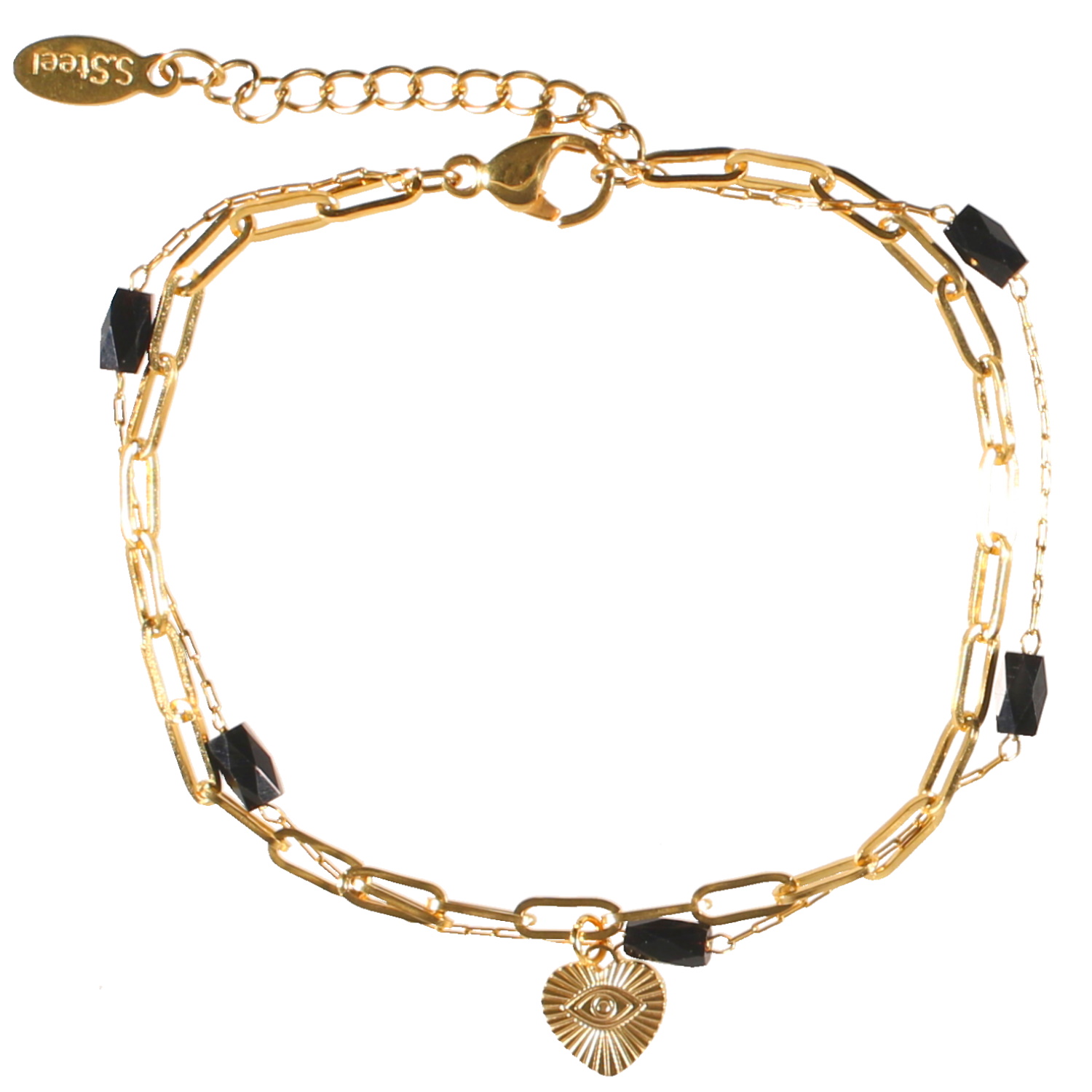 Bracelet double rangs composé d'une chaîne en acier doré avec perles rectangulaires de couleur noire, ainsi qu'une chaîne avec pendant en forme de cœur avec le motif d'œil de Turquie en acier doré.