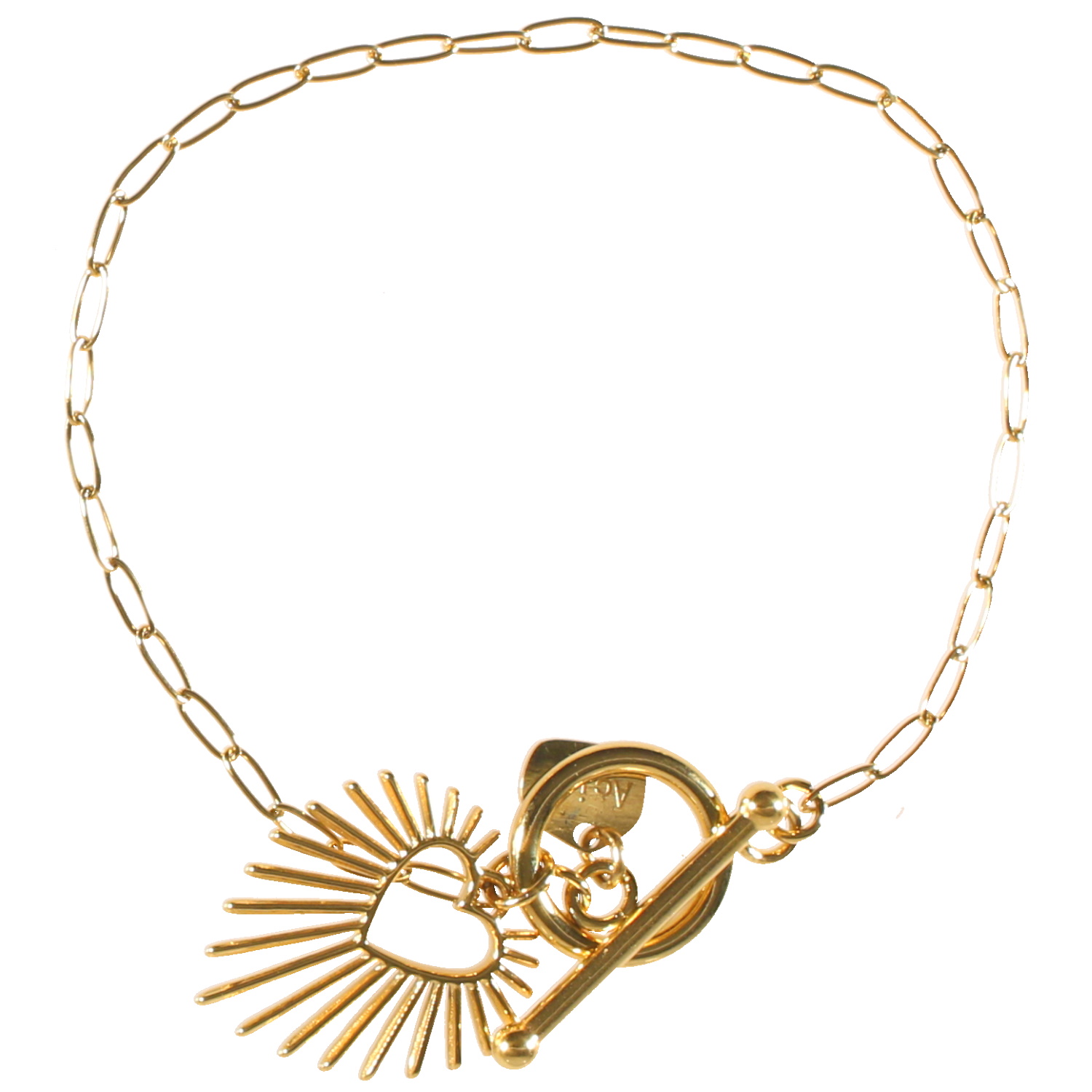 Description Bracelet composé d'une chaîne avec pendant cœur aux rayons de soleil et fermoir cabillaud en acier doré. Longueur 18 cm [Guide des tailles] Largeur 23 mm Matière(s) Acier . L'acier utilisé dans la bijouterie existe sous plusieurs qualités. Nous utilisons principalement la qualité 316L, qualité qui est utilisée en chirurgie. Cet acier est donc inoxydable et reste très résistant. Fermoir Cabillaud À noter Pendant 19x21 mm Couleur(s) dominante(s) Doré Public Adolescent , Adulte . Genre Femme , Fille . Saison Indémodable . Thème(s) Amour , Nature . Cliquez sur une matière, un thème, une couleur ou une collection pour voir tous les articles associés.