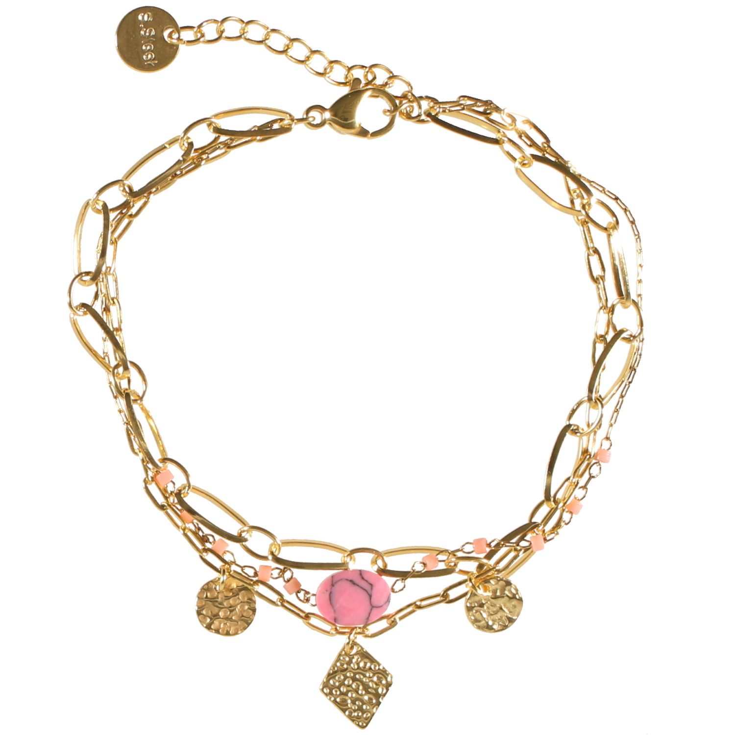 Description Bracelet triple rangs composé d'une chaîne en acier doré avec perles cylindriques de couleur rose et une pierre ovale de couleur rose, une chaîne en acier doré, ainsi qu'une chaîne avec pampilles rondes et en losange martelées en acier doré. Fermoir mousqueton avec 3 cm de rallonge. Longueur 17+3 cm [Guide des tailles] Largeur 10 mm Matière(s) Acier , Rocaille . L'acier utilisé dans la bijouterie existe sous plusieurs qualités. Nous utilisons principalement la qualité 316L, qualité qui est utilisée en chirurgie. Cet acier est donc inoxydable et reste très résistant. Fermoir Mousqueton Couleur(s) dominante(s) Doré , Rose Public Adolescent , Adulte . Genre Femme , Fille . Saison Indémodable . Cliquez sur une matière, un thème, une couleur ou une collection pour voir tous les articles associés.