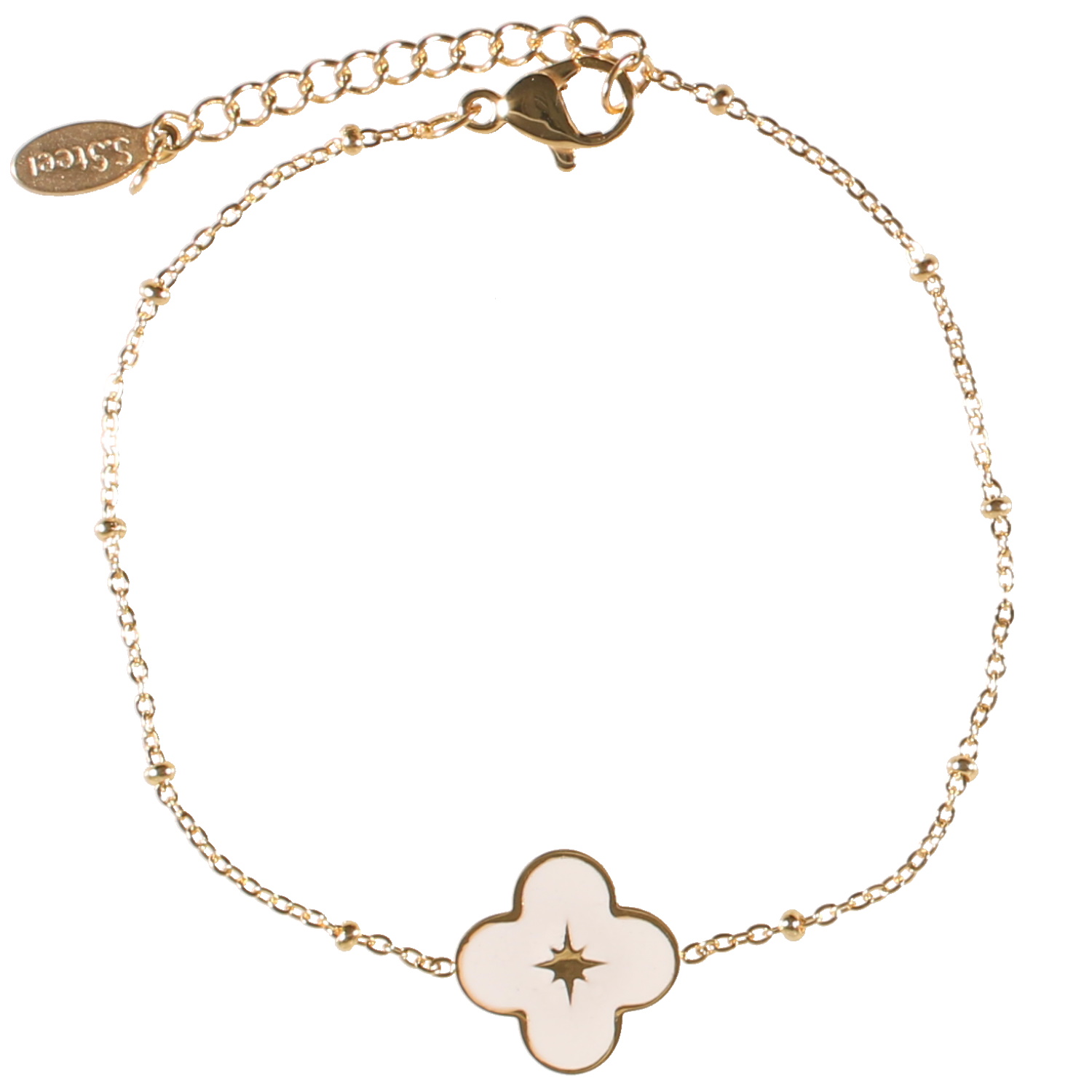 Bracelet composé d'une chaîne en acier doré et d'un trèfle à quatre feuilles pavé d'émail de couleur blanche avec une étoile en acier doré.