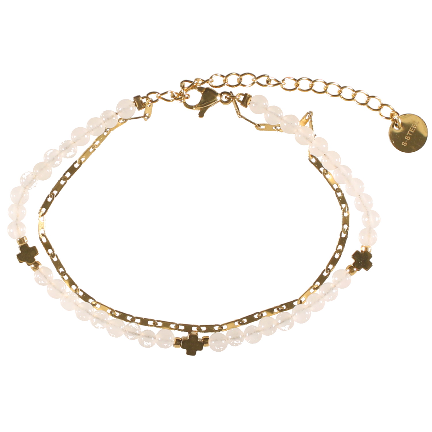 Bracelet double rangs composé d'une chaîne en acier doré, ainsi qu'un bracelet de perles de couleur blanche et de trois croix en acier doré.