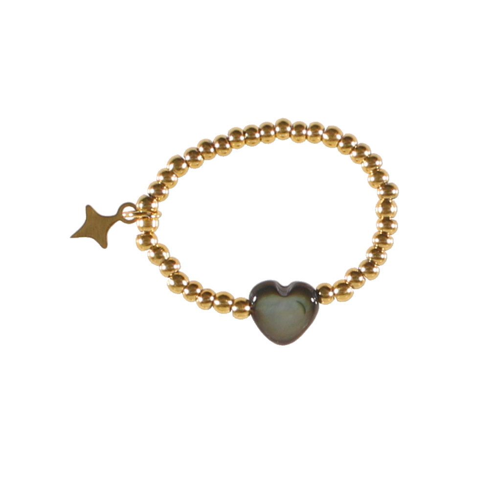 Bague élastique composée de perles en acier doré, d'un cœur en nacre de couleur grise et d'une pampille étoile en acier doré sertie d'un cristal.