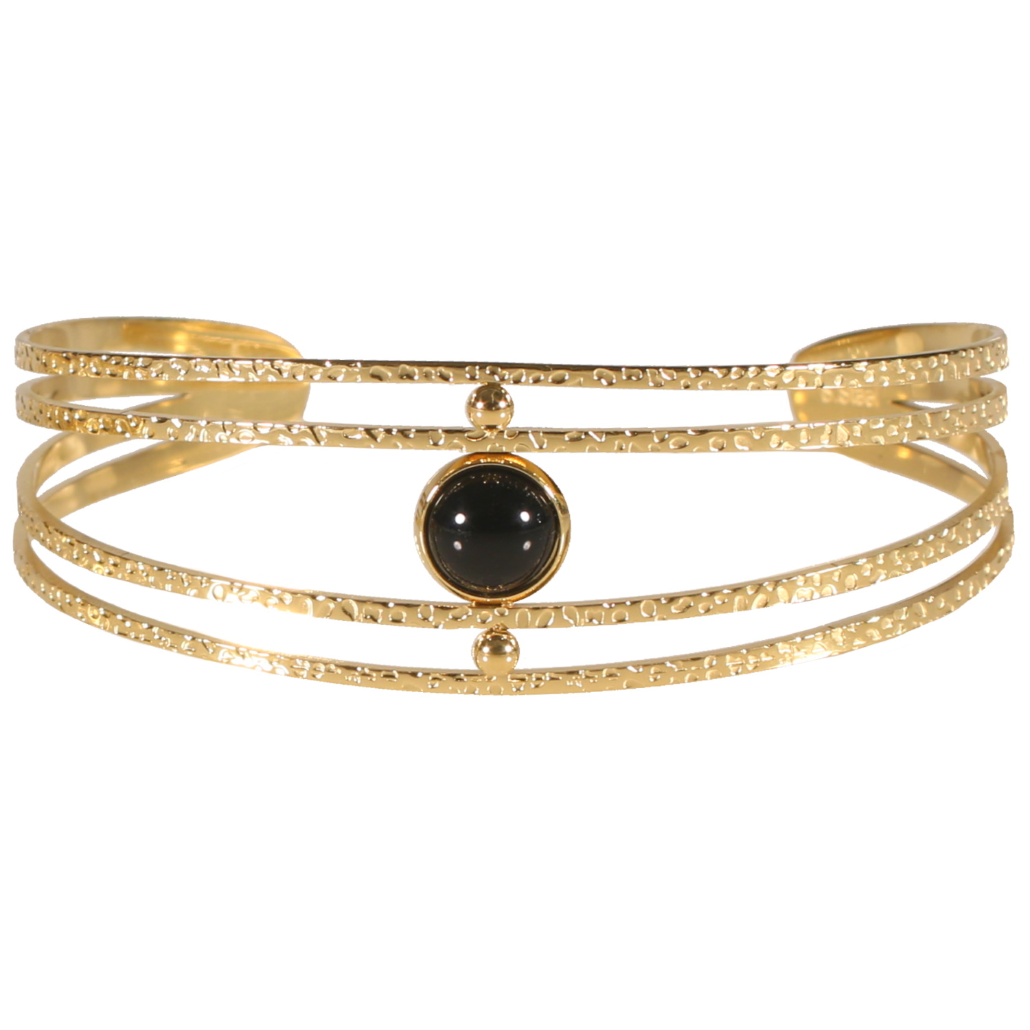 Description Bracelet jonc ouvert quatre rangs en acier doré martelé surmonté d'un cabochon de couleur noir. Largeur 21 mm Diamètre 64 mm [Guide des tailles] Matière(s) Acier , Rocaille . L'acier utilisé dans la bijouterie existe sous plusieurs qualités. Nous utilisons principalement la qualité 316L, qualité qui est utilisée en chirurgie. Cet acier est donc inoxydable et reste très résistant. Fermoir Aucun Couleur(s) dominante(s) Doré , Noir Public Adolescent , Adulte . Genre Femme , Fille . Saison Indémodable . Cliquez sur une matière, un thème, une couleur ou une collection pour voir tous les articles associés.