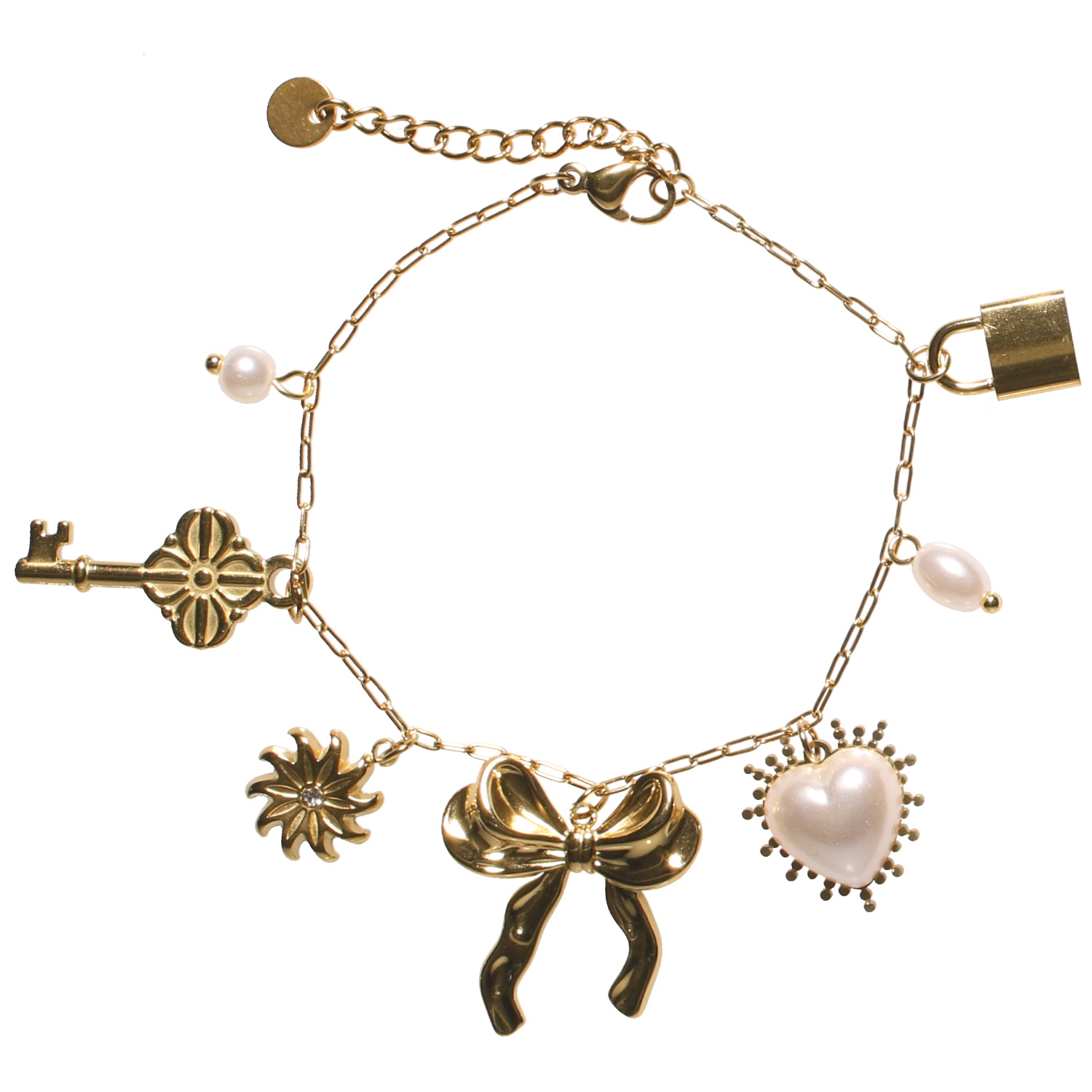 Bracelet composé d'une chaîne en acier doré, de breloques en forme de cadenas, de nœud papillon, de clé en acier doré, d'un cœur surmonté de perle d'imitation, d'un soleil serti d'un strass et de deux perles d'imitation.