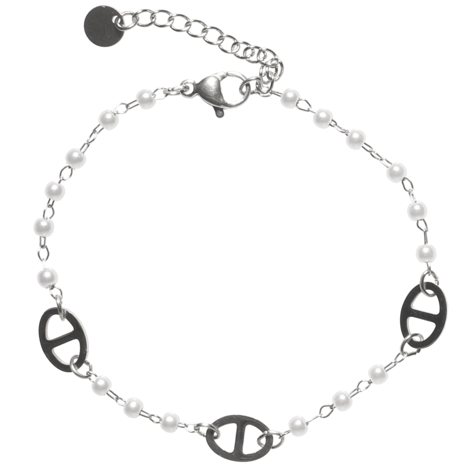Bracelet composé d'une chaîne avec symboles en acier argenté et de perles d'imitation.