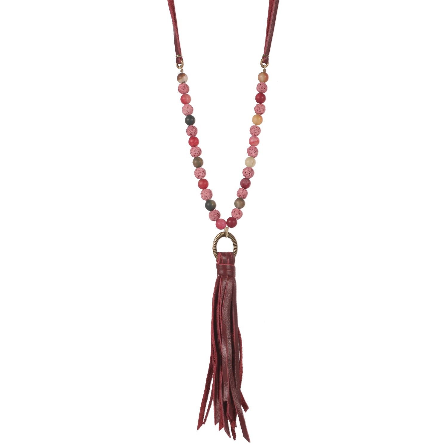 Collier sautoir en métal doré, suédine et perles en pierres synthétiques et pierre d'imitation de lave volcanique.