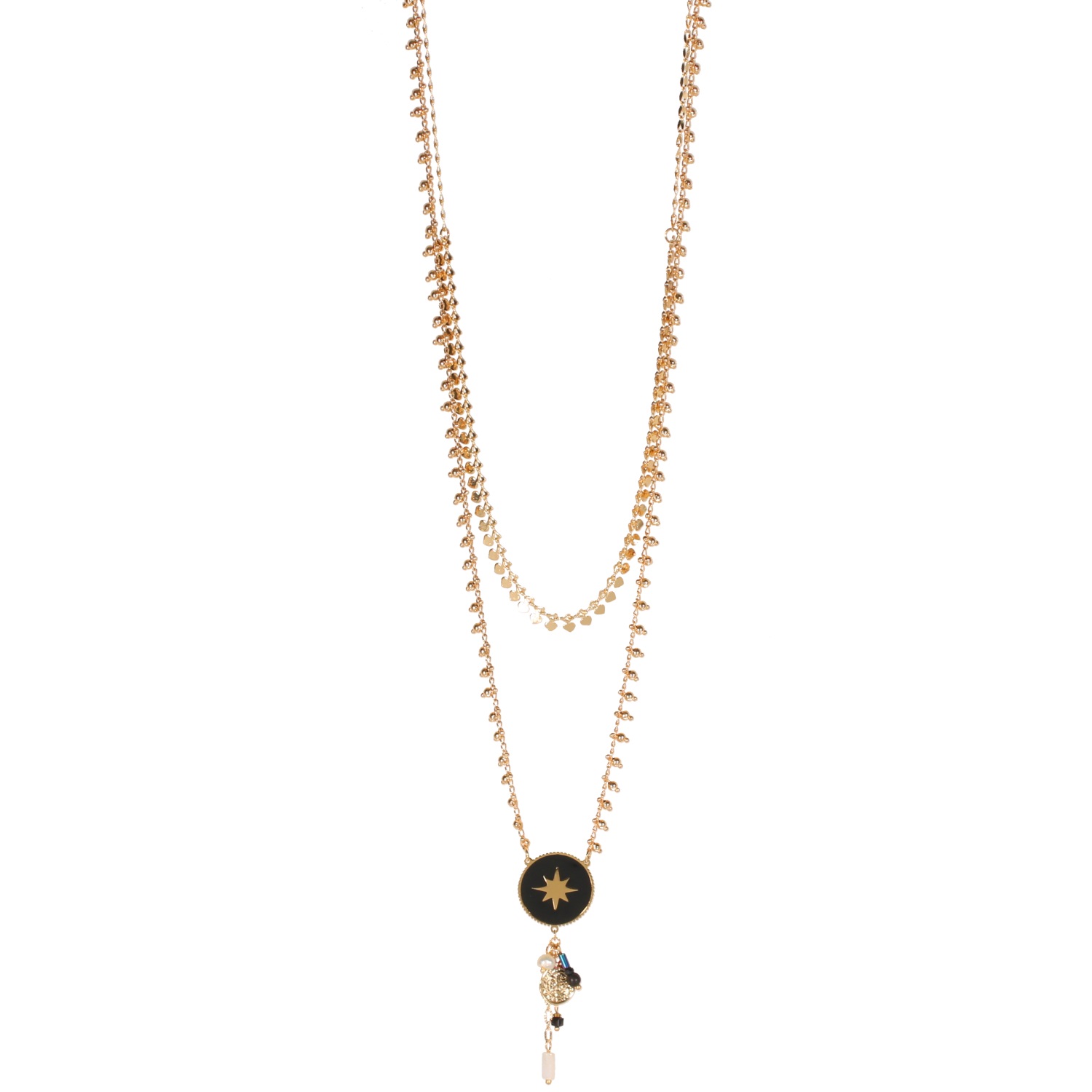 Collier sautoir fantaisie double rangs avec pendentifs et perles en métal doré, émail, nacre et pierres de couleur.