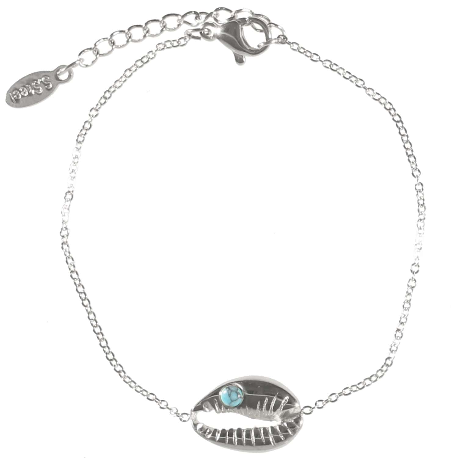 Description Bracelet avec coquillage cauri en acier argenté et pierre d'imitation turquoise. Fermoir mousqueton avec rallonge de 3 cm. Cliquez sur une matière, un thème, une couleur ou une collection pour voir tous les articles associés.
