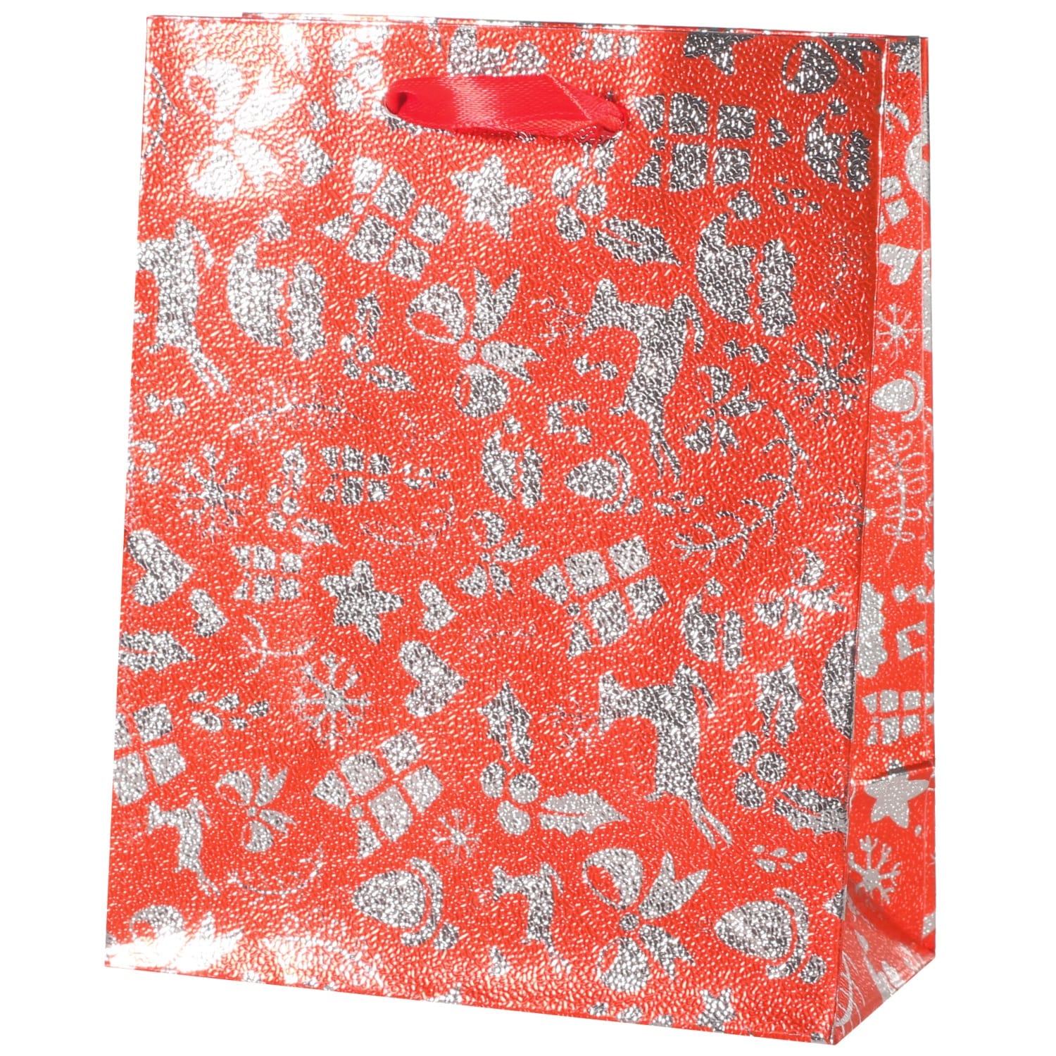 Pochette cadeaux de couleur rouge idéale pour la fête de Noël avec motifs de couleur argenté.