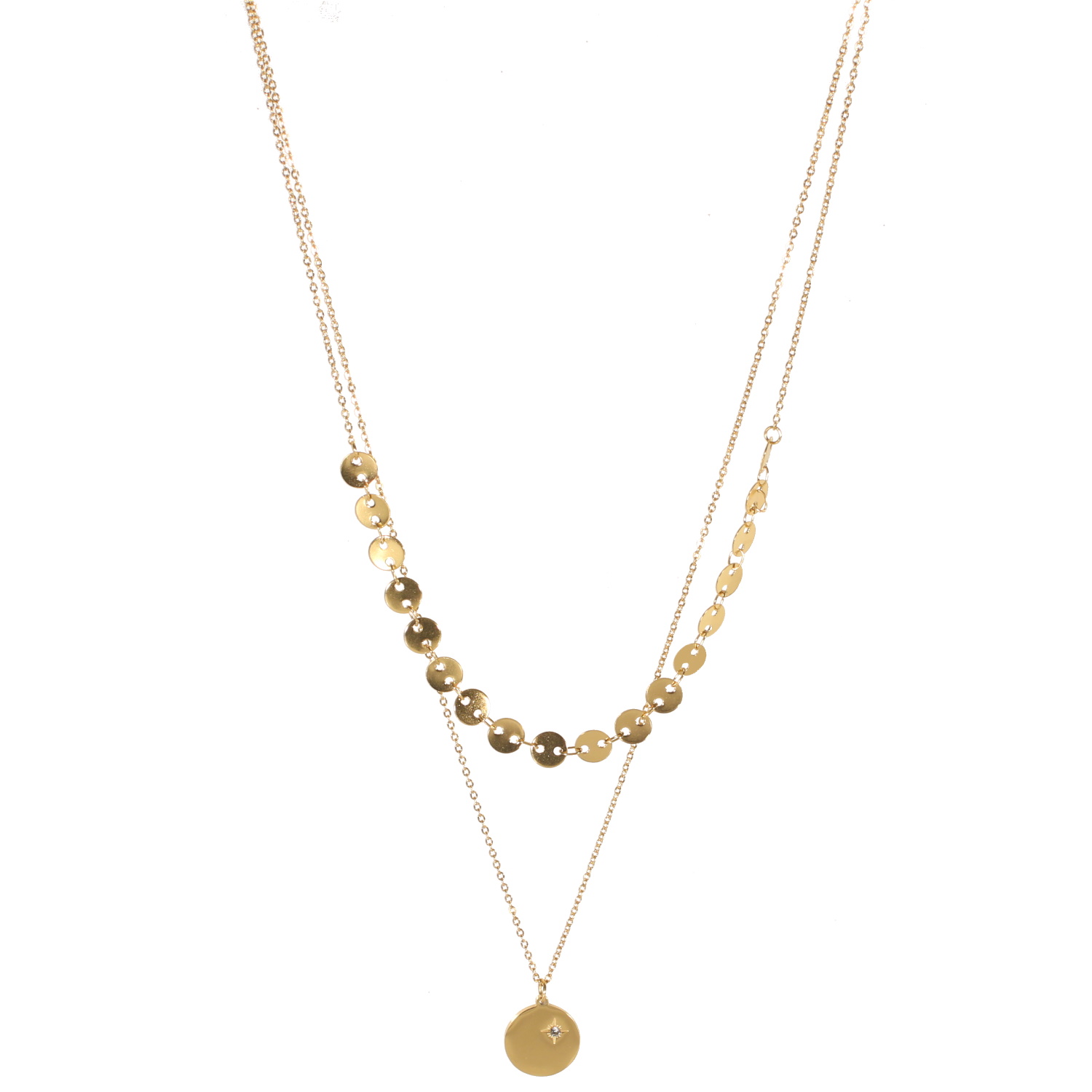 Description Collier double rangs composé d'une chaîne de 40 cm de long avec pampilles rondes en acier doré, ainsi qu'une chaîne de 46 cm de long en acier doré et un pendentif pastille ronde avec motif d'étoile en acier doré sertie d'un cristal au centre de l'étoile. Fermoir mousqueton avec 7 cm de rallonge. Cliquez sur une matière, un thème, une couleur ou une collection pour voir tous les articles associés.