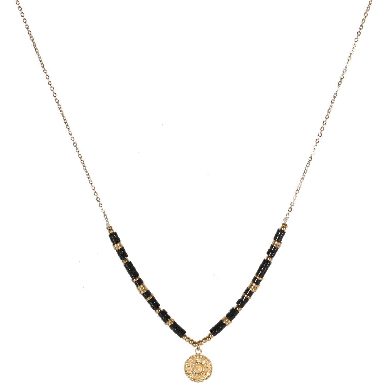 Collier composé d'une chaîne et de perles cylindriques en acier doré, de perles cylindriques en véritable pierre d'agate et d'un pendentif rond avec motif en acier doré.
