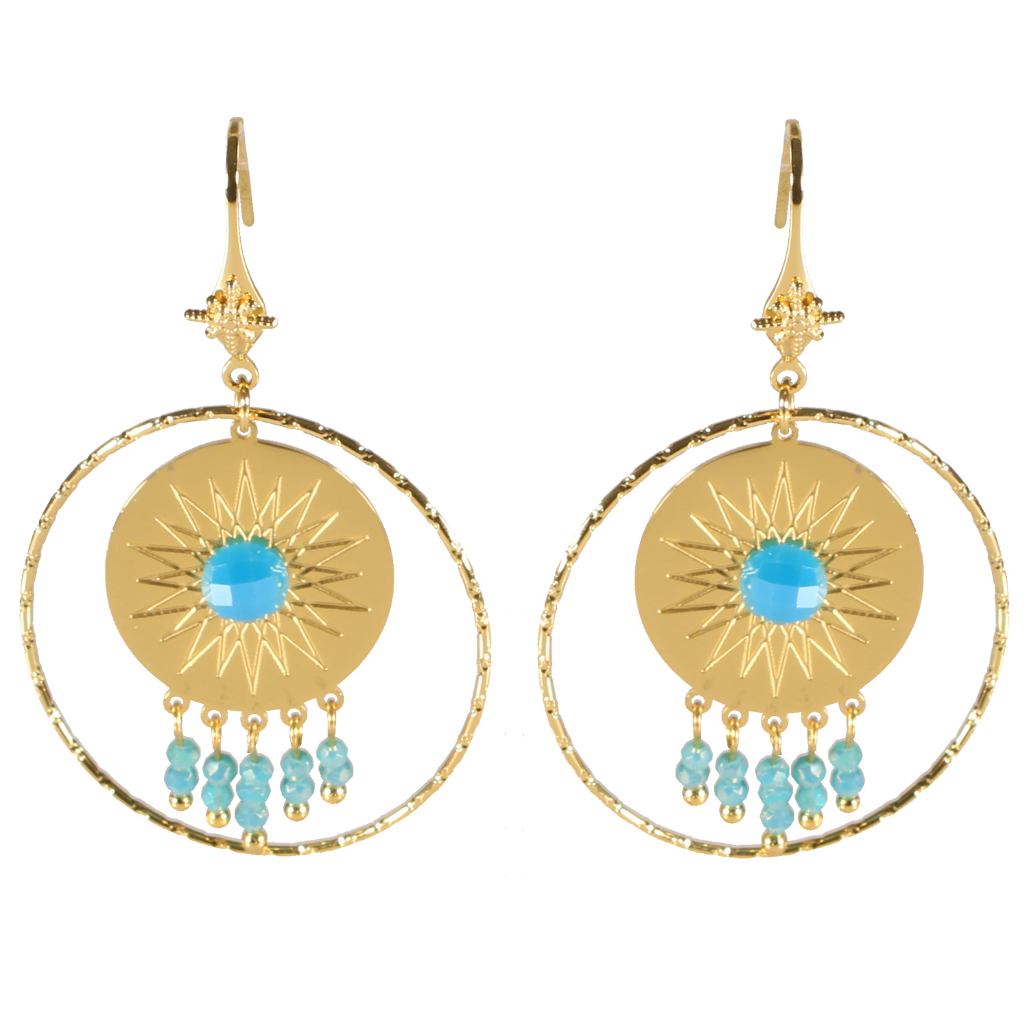 Description Boucles d'oreilles pendantes composées d'une étoile et d'un cercle en acier doré, d'une pastille ronde représentant un soleil en acier doré surmontée d'une pierre de couleur bleue turquoise, et des pampilles de perles de couleur bleue turquoise. Largeur 34 mm Hauteur 53 mm Matière(s) Acier , Rocaille . L'acier utilisé dans la bijouterie existe sous plusieurs qualités. Nous utilisons principalement la qualité 316L, qualité qui est utilisée en chirurgie. Cet acier est donc inoxydable et reste très résistant. Fermoir Crochets Couleur(s) dominante(s) Bleu , Doré Public Adolescent , Adulte . Genre Femme , Fille . Saison Indémodable . Thème(s) Nature . Cliquez sur une matière, un thème, une couleur ou une collection pour voir tous les articles associés.