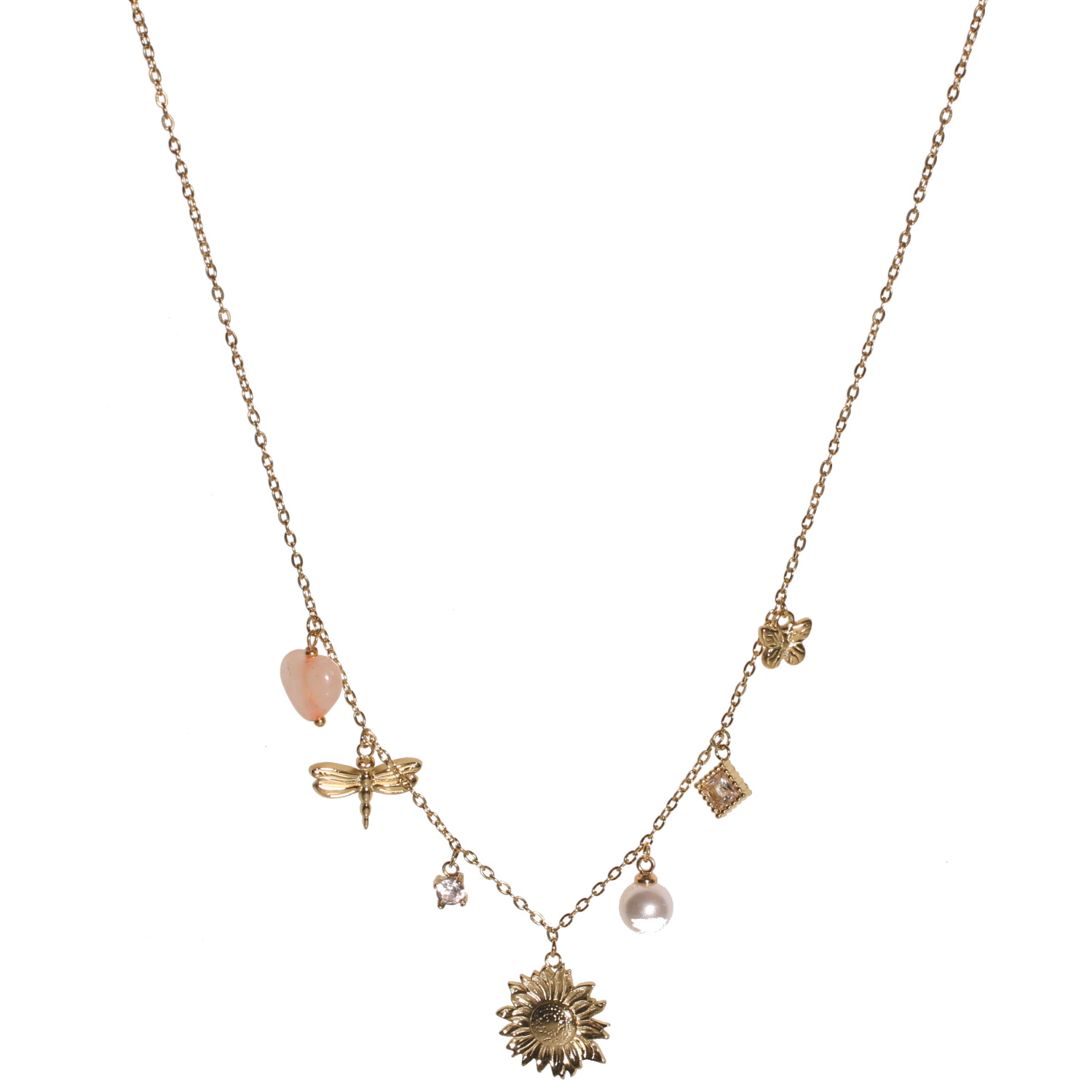 Collier composé d'une chaîne avec pendants papillon, libellule et tournesol en acier doré, d'une perle d'imitation, d'une pierre en forme de cœur, d'un cristal serti clos en forme de losange et d'un cristal serti griffes de forme carré.