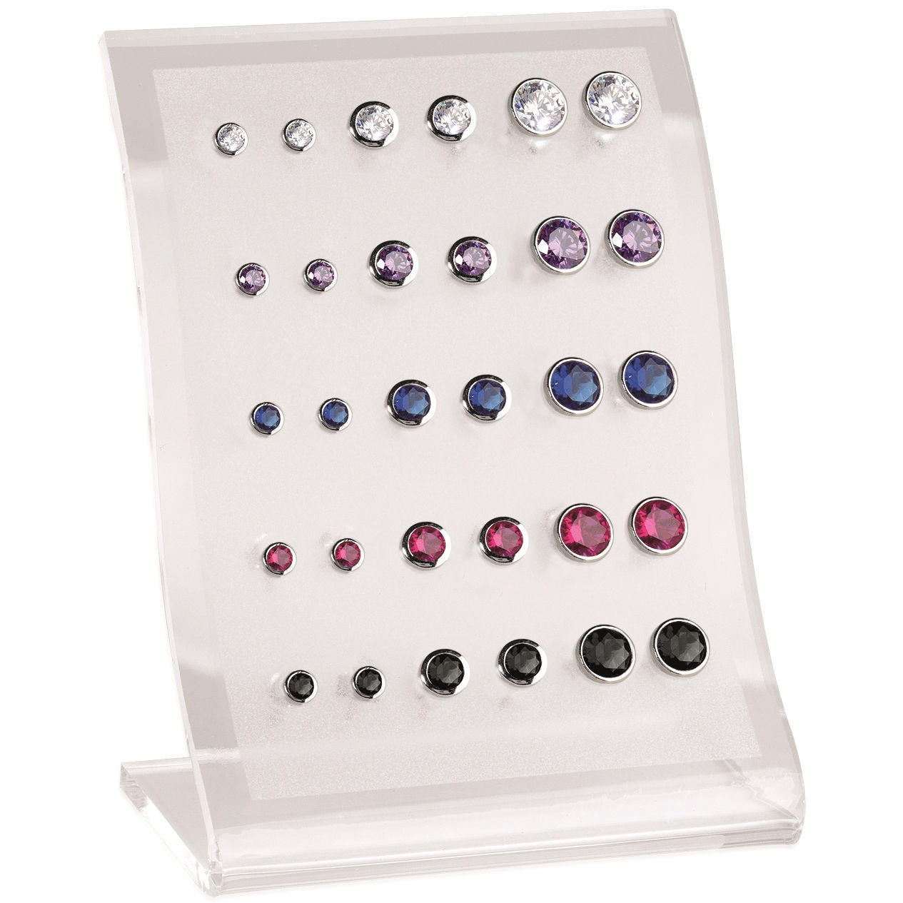 Présentoir comprenant 15 paires de boucles d'oreilles en argent 925/000 rhodié, oxyde de zirconium et pierres synthétiques.
