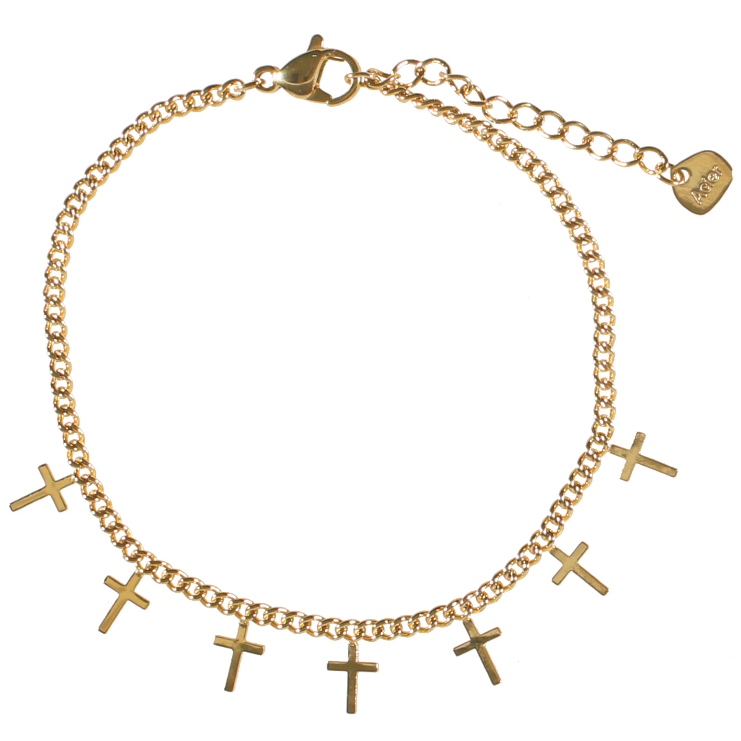 Description Bracelet avec pendants en forme de croix en acier doré. Fermoir mousqueton avec 3 cm de rallonge. Longueur 16+3 cm [Guide des tailles] Largeur 9 mm Matière(s) Acier . L'acier utilisé dans la bijouterie existe sous plusieurs qualités. Nous utilisons principalement la qualité 316L, qualité qui est utilisée en chirurgie. Cet acier est donc inoxydable et reste très résistant. Fermoir Mousqueton Couleur(s) dominante(s) Doré Public Adolescent , Adulte . Genre Femme , Fille . Saison Indémodable . Thème(s) Religion . Cliquez sur une matière, un thème, une couleur ou une collection pour voir tous les articles associés.