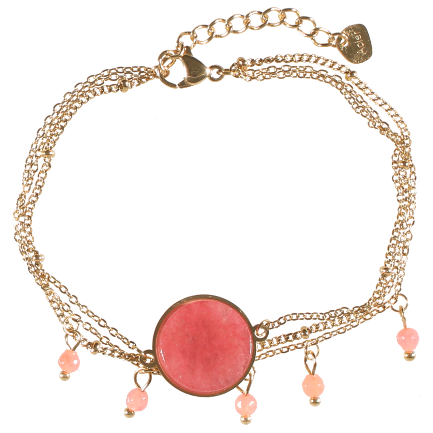 Bracelet triple rangs composé d'une chaîne en acier doré, une chaîne en acier doré avec 5 perles en véritable pierre de quartz rose, ainsi qu'une chaîne en acier doré surmontée d'une pastille ronde pavée d'une véritable pierre de quartz rose.