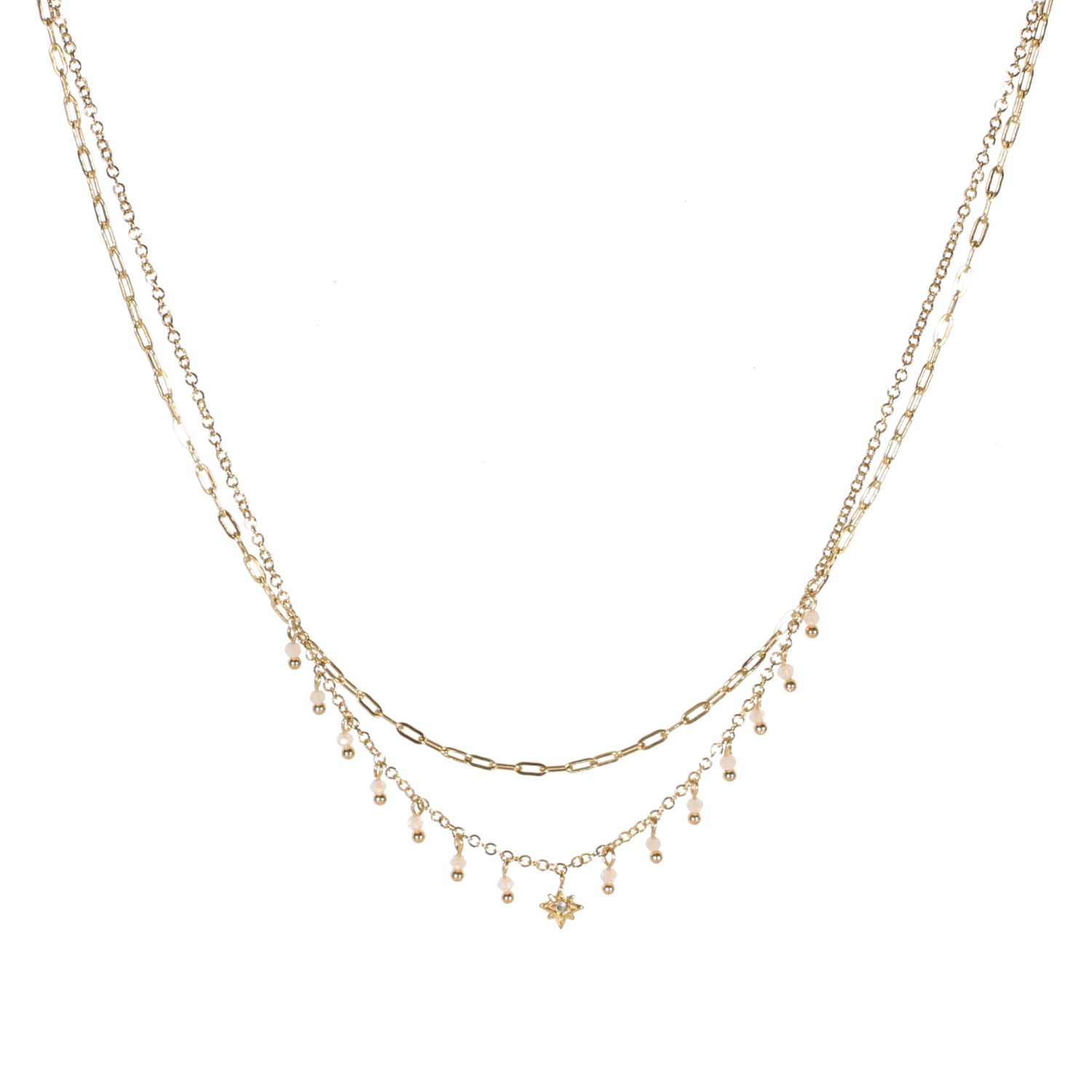 Collier double rangs composé d'une chaîne de 39 cm de long en acier doré, ainsi qu'une chaîne de 40 cm de long avec des pampilles perles en pierre de lune et un pendentif étoile en acier doré serti clos d'un cristal.