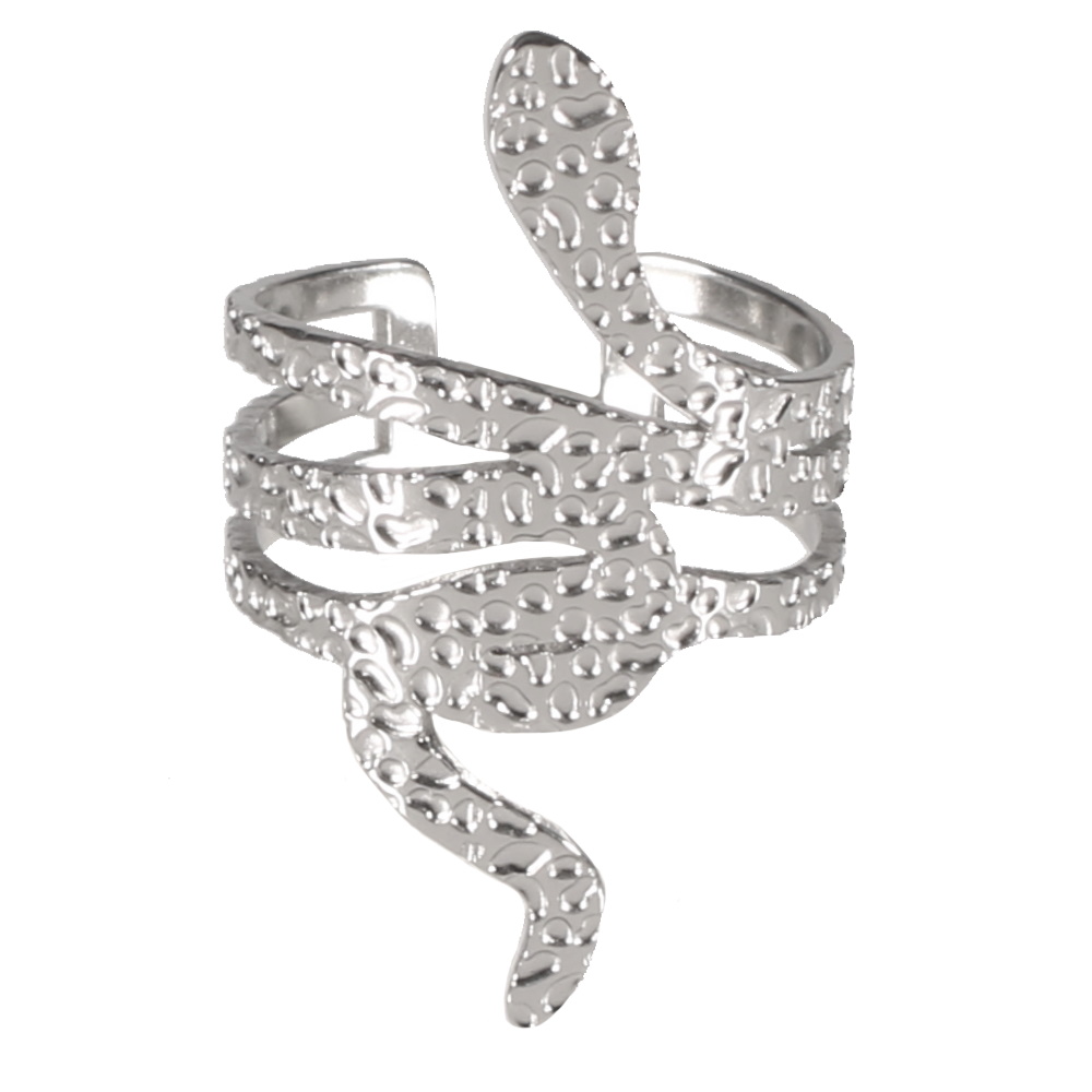 Description Bague en forme de serpent martellé en acier argenté. Taille ajustable. Largeur 32 mm Matière(s) Acier . L'acier utilisé dans la bijouterie existe sous plusieurs qualités. Nous utilisons principalement la qualité 316L, qualité qui est utilisée en chirurgie. Cet acier est donc inoxydable et reste très résistant. Fermoir Aucun Couleur(s) dominante(s) Argenté Public Adolescent , Adulte . Genre Femme , Fille . Saison Indémodable . Thème(s) Animaux . Cliquez sur une matière, un thème, une couleur ou une collection pour voir tous les articles associés.