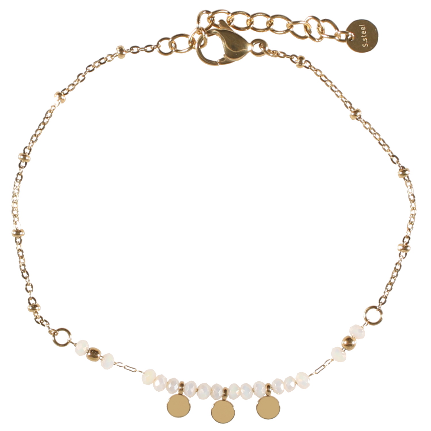 Description Bracelet composé d'une chaîne avec trois pampilles rondes en acier doré et de perles de couleur blanche. Fermoir mousqueton avec 3 cm de rallonge. Cliquez sur une matière, un thème, une couleur ou une collection pour voir tous les articles associés.