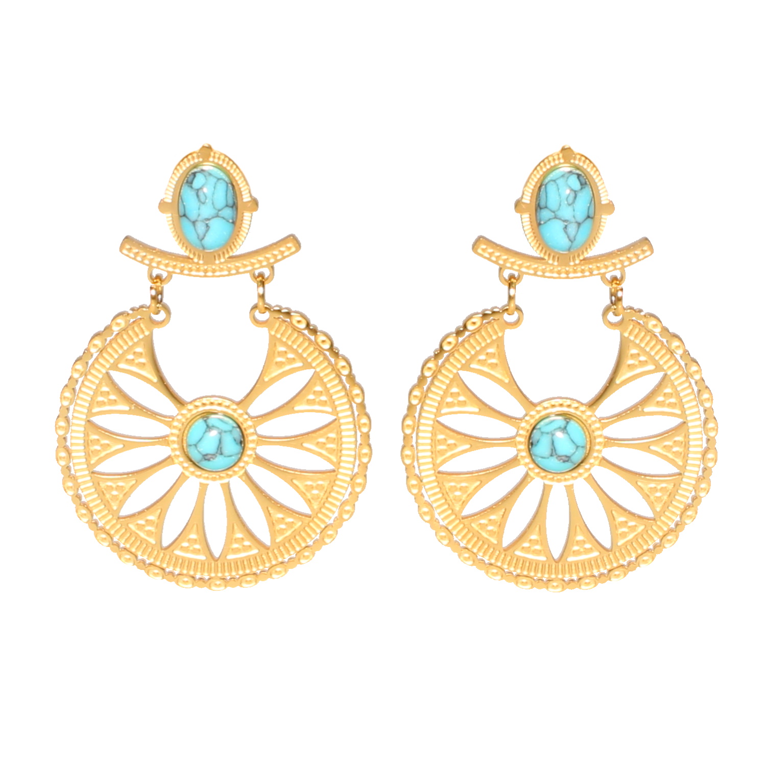 Description Boucles d'oreilles pendantes composées d'une puces ovales en acier doré serties d'une pierre turquoise d'imitation et d'une rosace en acier doré sertie d'un cabochon en pierre turquoise d'imitation. Largeur 23 mm Hauteur 33 mm Matière(s) Acier , Rocaille . L'acier utilisé dans la bijouterie existe sous plusieurs qualités. Nous utilisons principalement la qualité 316L, qualité qui est utilisée en chirurgie. Cet acier est donc inoxydable et reste très résistant. Fermoir Tiges poussettes Couleur(s) dominante(s) Bleu , Doré Public Adolescent , Adulte . Genre Femme , Fille . Saison Indémodable . Cliquez sur une matière, un thème, une couleur ou une collection pour voir tous les articles associés.