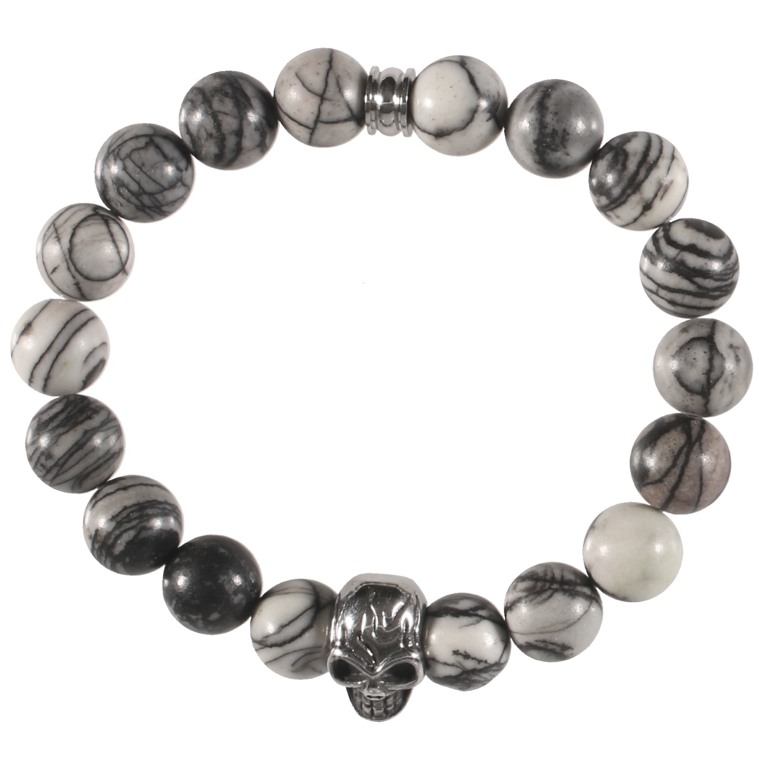 Description Bracelet élastique avec perles de couleur et tête de mort en acier argenté. Cliquez sur une matière, un thème, une couleur ou une collection pour voir tous les articles associés.