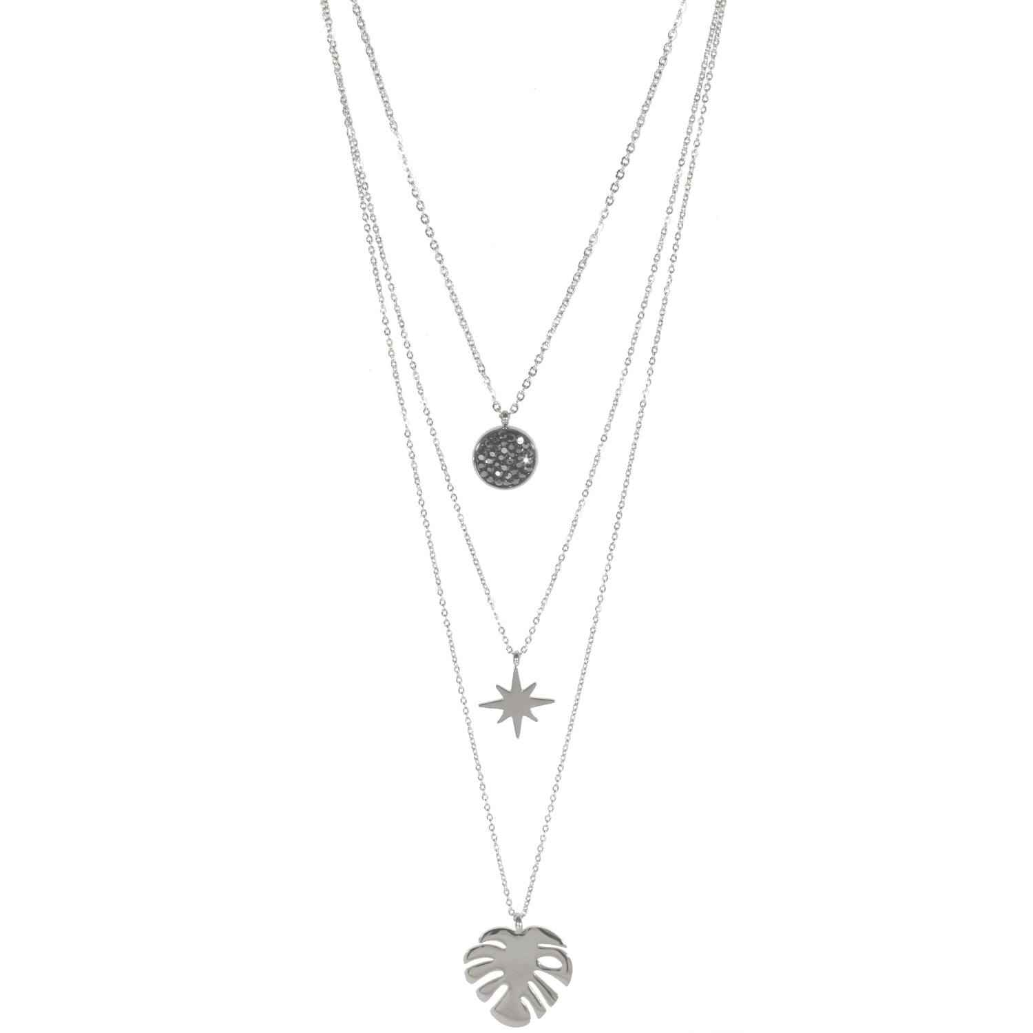 Description Collier trois rangs avec pendentifs en acier argenté et cristaux synthétiques. Cliquez sur une matière, un thème, une couleur ou une collection pour voir tous les articles associés.