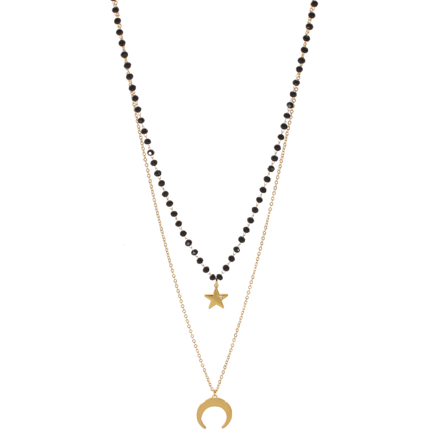 Collier double rangs avec étoile et croissant de lune en acier doré, un cristal et perles de couleur.