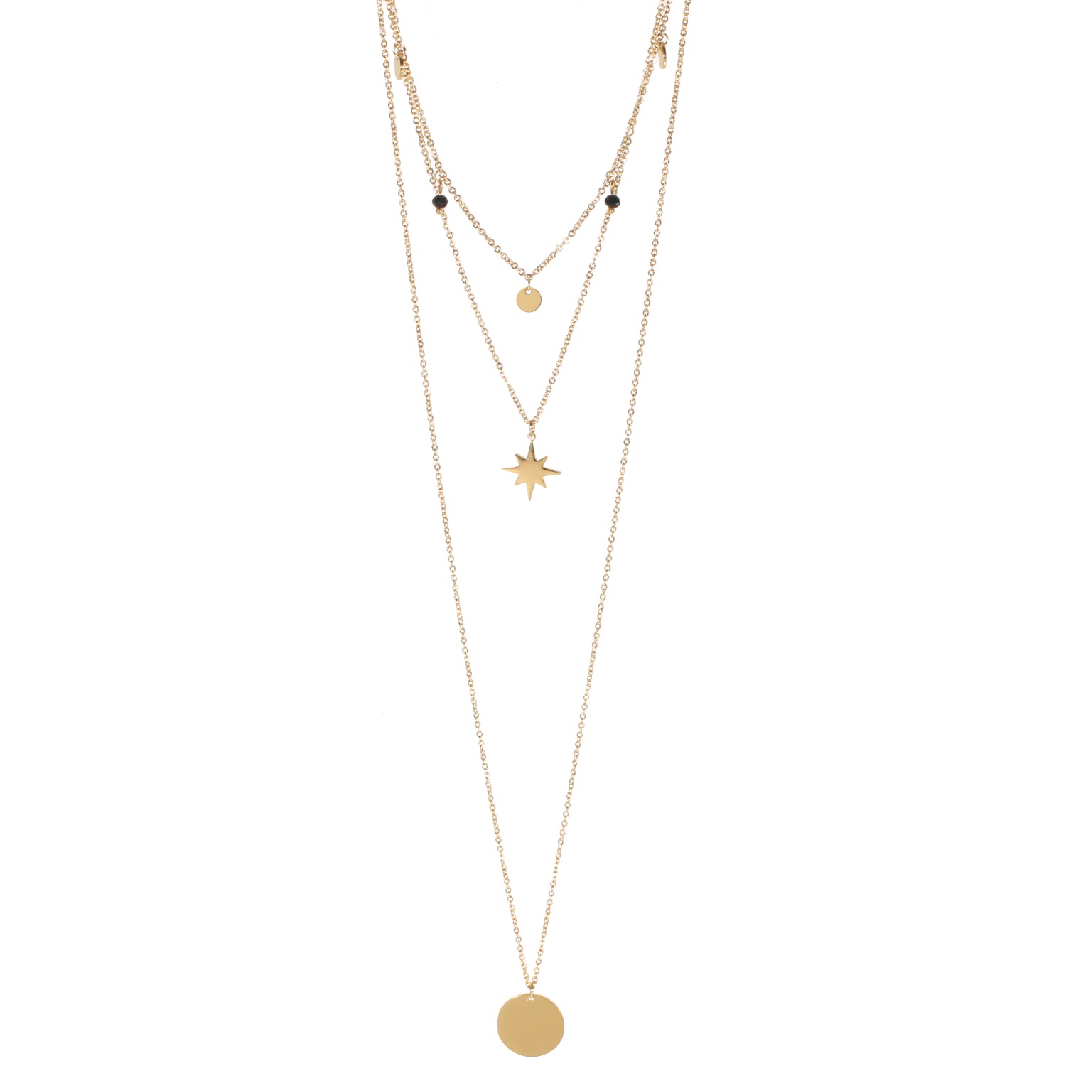 Description Collier triple rangs composé d'un collier court de 37 cm de long avec pampilles et perles de couleur noire, un collier 42 cm de long avec pendentif étoile en acier doré ainsi qu'un collier de 70 cm de long avec pastille lisse en acier doré. L'ensemble peut se régler jusqu'à 5 cm de plus. Longueur 37/42/70+5 cm [Guide des tailles] Matière(s) Acier , Rocaille . L'acier utilisé dans la bijouterie existe sous plusieurs qualités. Nous utilisons principalement la qualité 316L, qualité qui est utilisée en chirurgie. Cet acier est donc inoxydable et reste très résistant. Fermoir Mousqueton À noter Pendentif étoile 14x16 mm et pastille 16 mm de diamètre Couleur(s) dominante(s) Doré , Noir Public Adolescent , Adulte . Genre Femme , Fille . Saison Indémodable . Thème(s) Nature . Collection Myriade Cliquez sur une matière, un thème, une couleur ou une collection pour voir tous les articles associés.