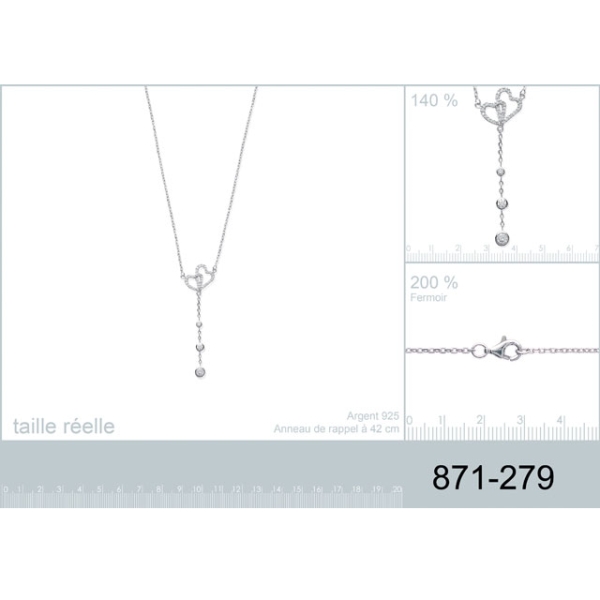 Description Collier en argent 925/000 rhodié et oxyde de zirconium. Longueur 42/45 cm [Guide des tailles] Matière(s) Argent 925 rhodié , Zirconium . Afin de protéger votre bijou de l'oxydation naturelle de l'argent, il est recouvert d'une couche de rhodium (un métal rare et précieux) qui garantira sa brillance dans le temps et préviendra les risques d'allergie. Notez cependant, que le bijou est alors d'une teinte plus grisée et moins brillante que l'argent non rhodié. Poids d'argent 3,85 gramme(s) Fermoir Mousqueton À noter Pendant 15 x 53 mm Couleur(s) dominante(s) Argenté , Multicolore , Transparent Public Adulte . Genre Femme . Saison Indémodable . Thème(s) Amour . Rayon en magasin TD Cliquez sur une matière, un thème, une couleur ou une collection pour voir tous les articles associés.