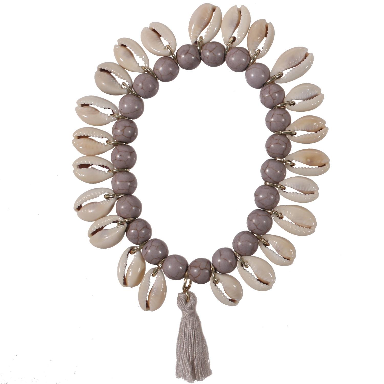 Bracelet fantaisie en métal doré, textile, résine et coquillage.