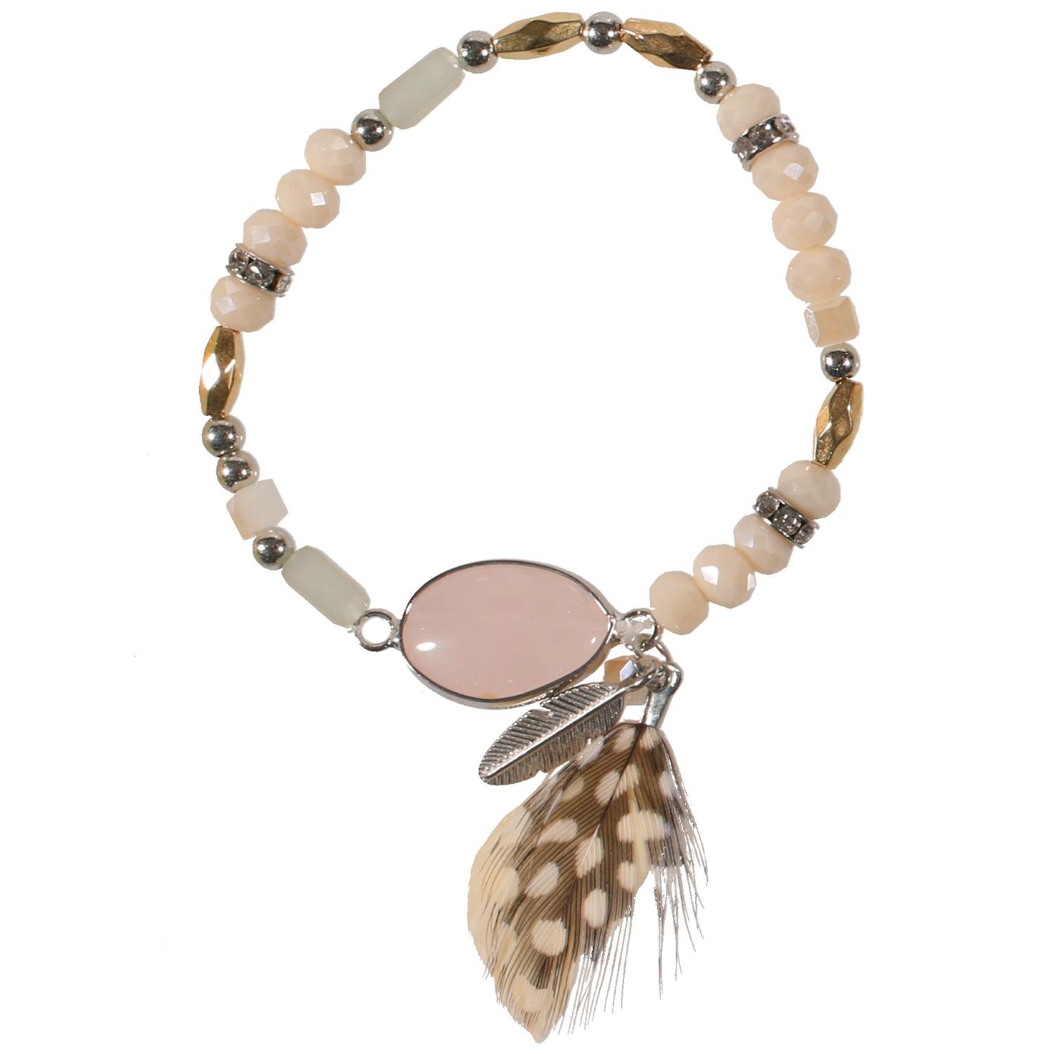 Bracelet fantaisie en métal doré, métal argenté, plume, cristaux synthétiques et résine.