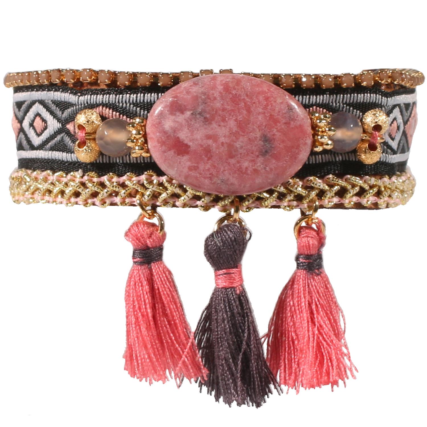 Bracelet fantaisie en métal doré, suédine, résine, rocaille et textile.
