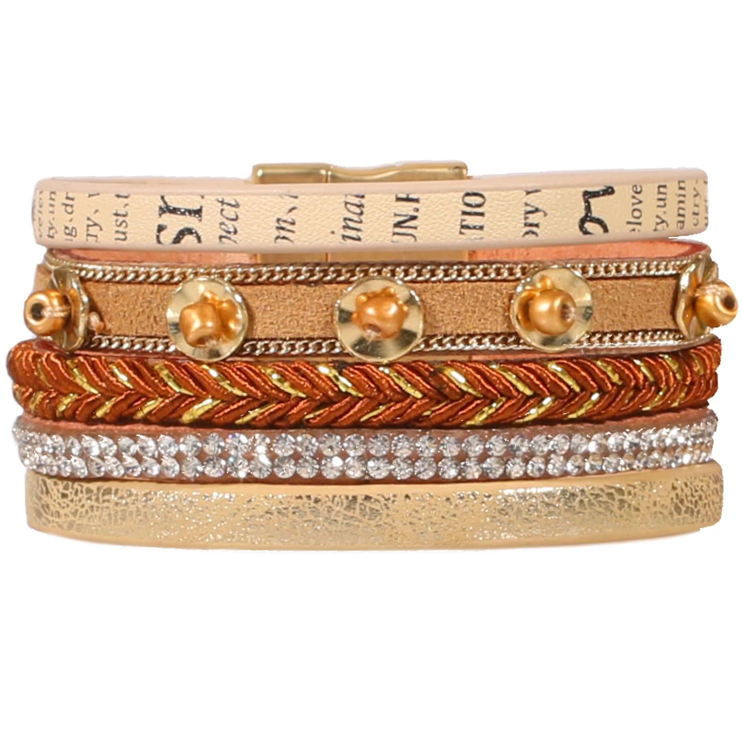 Bracelet fantaisie en métal doré, suédine, textile, cristaux synthétiques et résine.