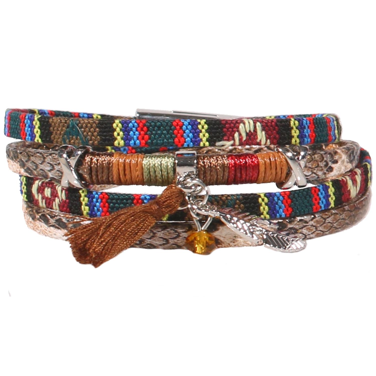 Bracelet fantaisie en suédine, textile, métal argenté et résine.