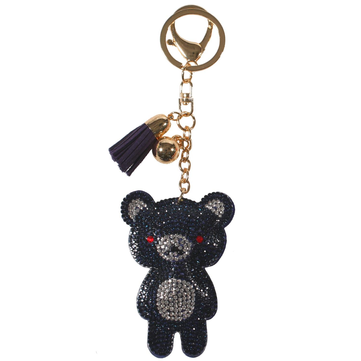 Porte-clés fantaisie en métal doré, textile, suédine et cristaux synthétiques.