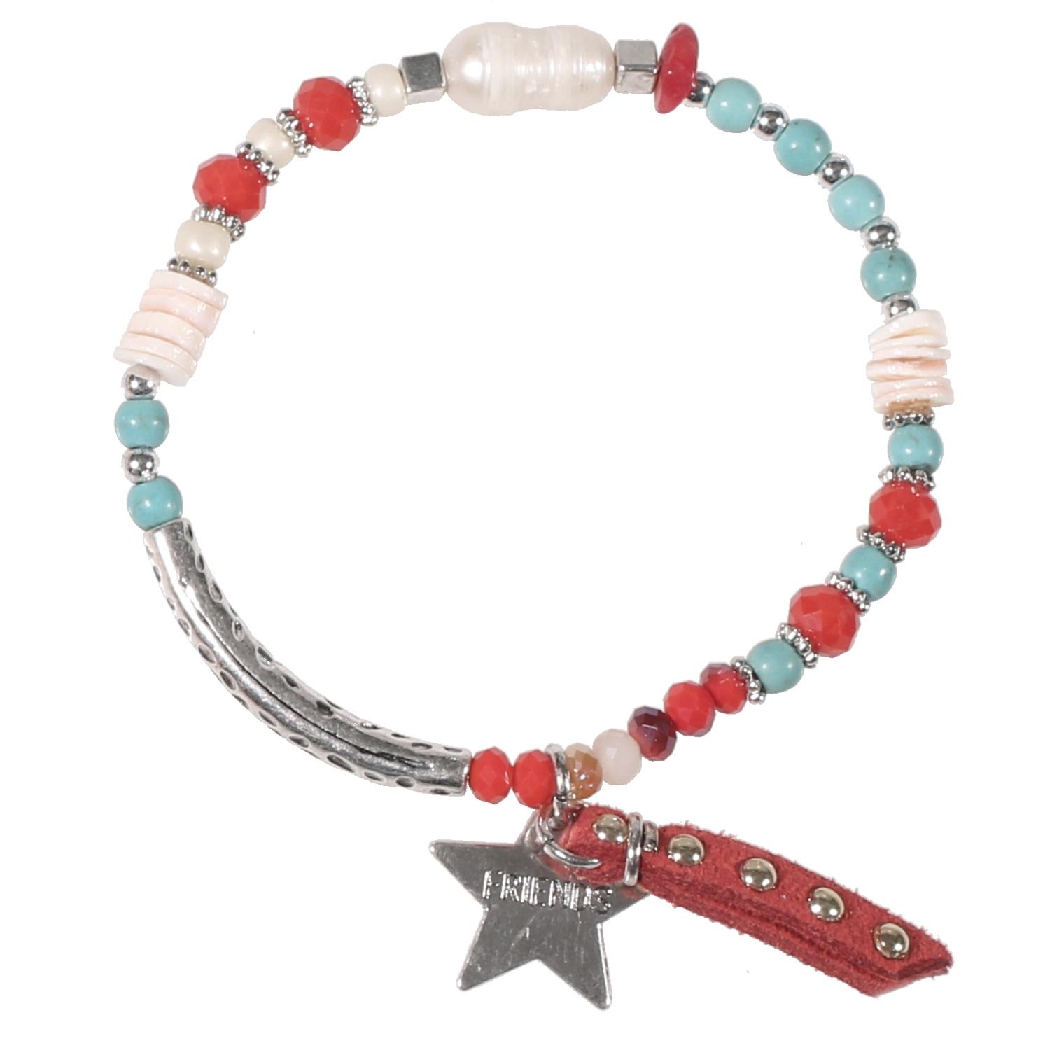Bracelet fantaisie en métal argenté, résine, rocaille et suédine.
