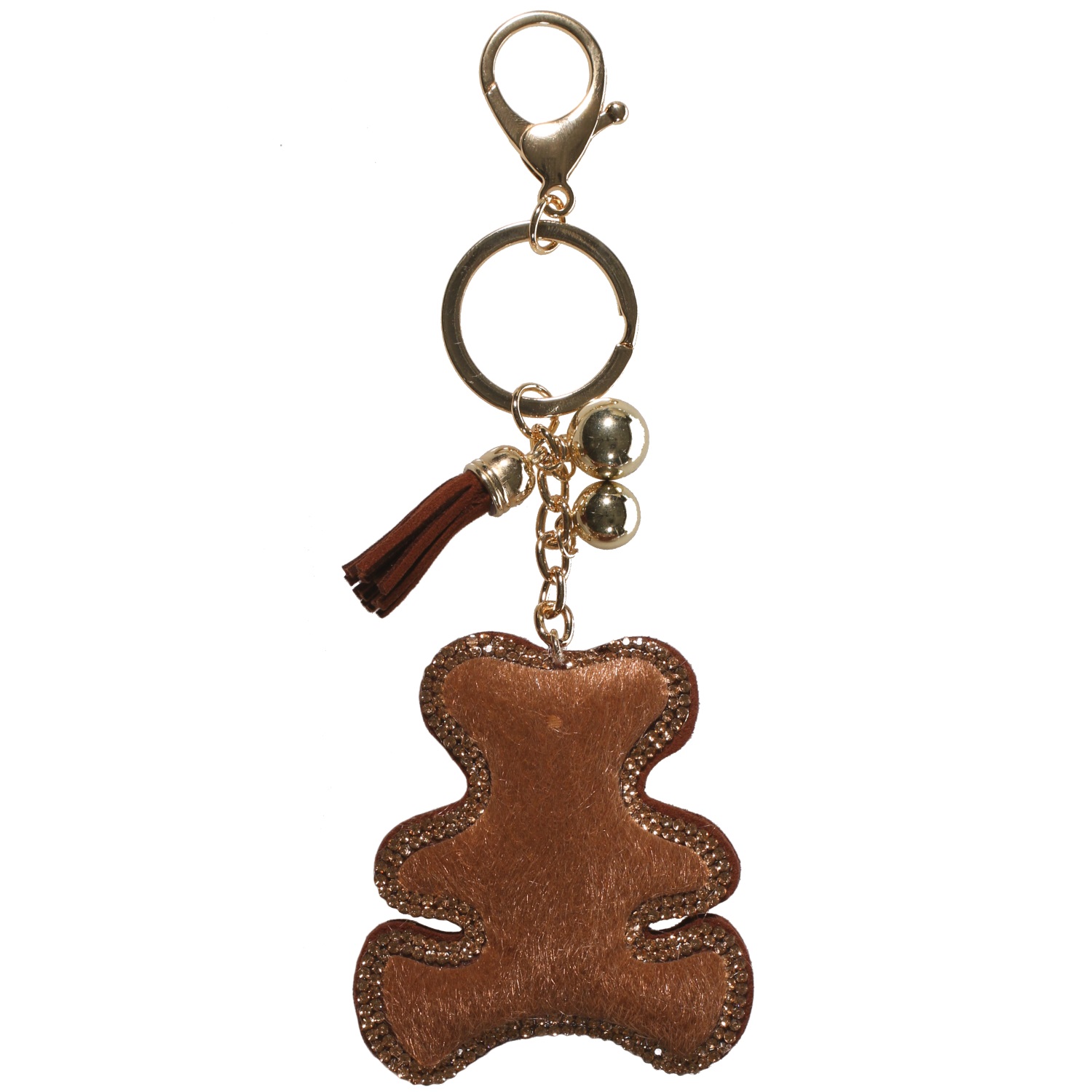 Porte-clés en métal doré, suédine, textile et cristaux synthétiques.