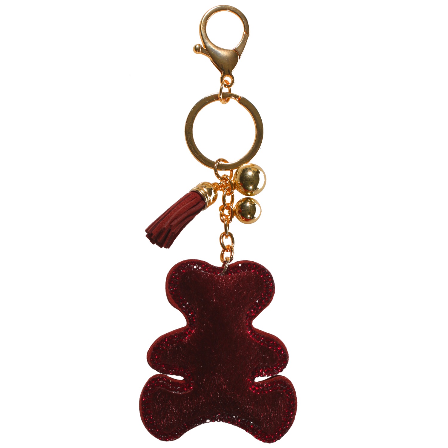 Porte-clés en métal doré, suédine, textile et cristaux synthétiques.