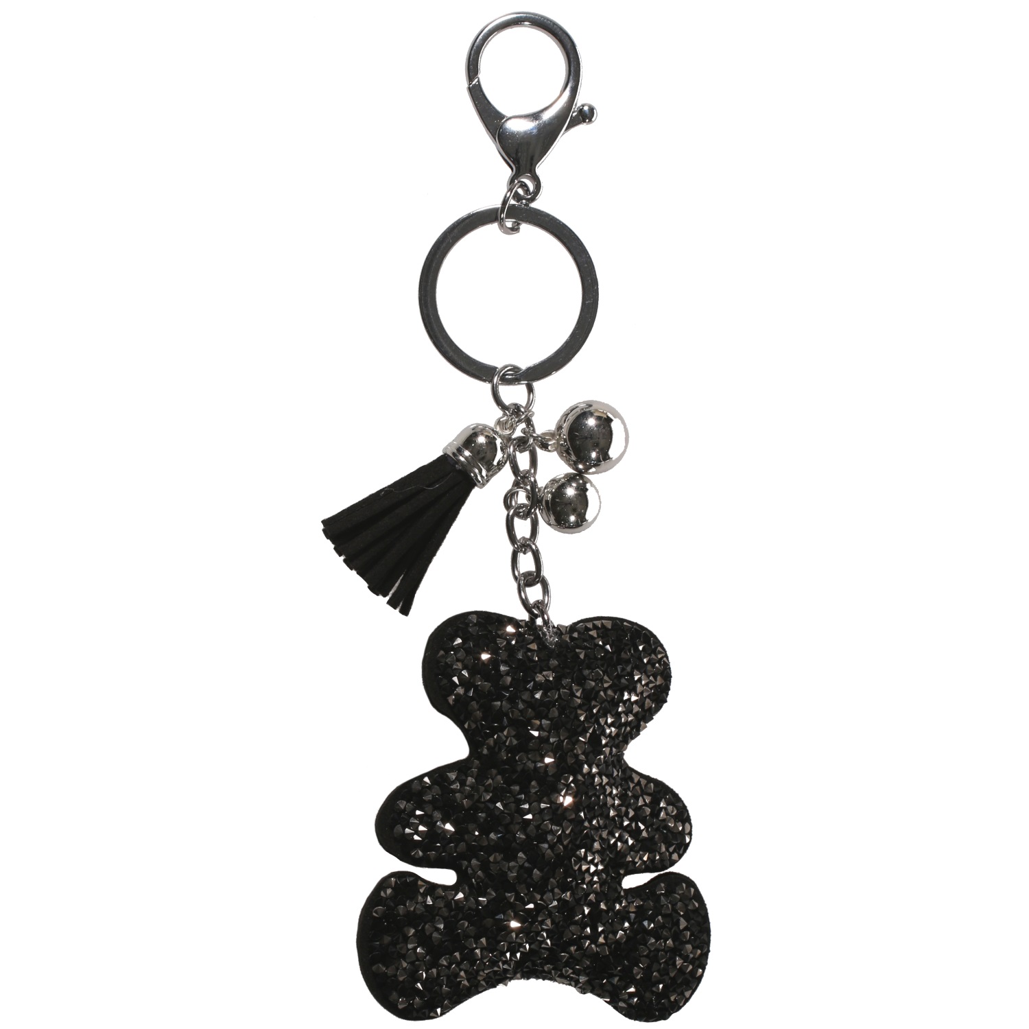 Porte-clés en métal argenté, suédine et cristaux synthétiques.